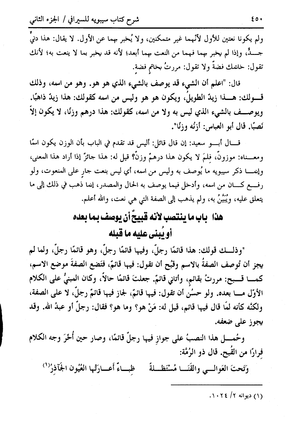 قال: " اعلم أن الشيء قد يوصف بالشيء الذي هو هو. وهو من اسمه، وذلك قولك: هذا زيد الطويل، ويكون هو هو وليس من اسمه كقولك: هذا زيد ذاهبا.