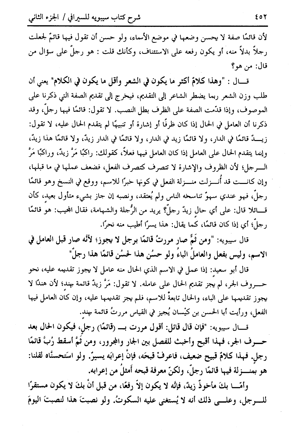 زيد قائما في الدار، ولا قائما زيد في الدار، ولا قائما في الدار زيد، ولا قائما هذا زيد، وإنما يتقدم الحال على العامل إذا كان العامل فيها فعلا، كقولك: راكبا مرّ زيد، وراكبا مرّ الرجل؛ لأن الظروف والإشارة لا تتصرف كتصرف الفعل، فضعف عملها في ما قبلها، وإن كانت قد أنزلت منزلة الفعل في كونها خبرا للاسم، ووقع في النسخ وهو قائما رجل، فهو عندي سهو تناسخه الناس ولم يعتقد، ونصبه إن جاز بشيء متأول بعيد، كأن قائلا قال: على أي حال زيد رجل؟ يريد من الرّجلة والشهامة، فقال المجيب: هو قائما رجل؛ أي إذا كان قائما، كما يقال: هذا يسرا أطيب منه نحرا.