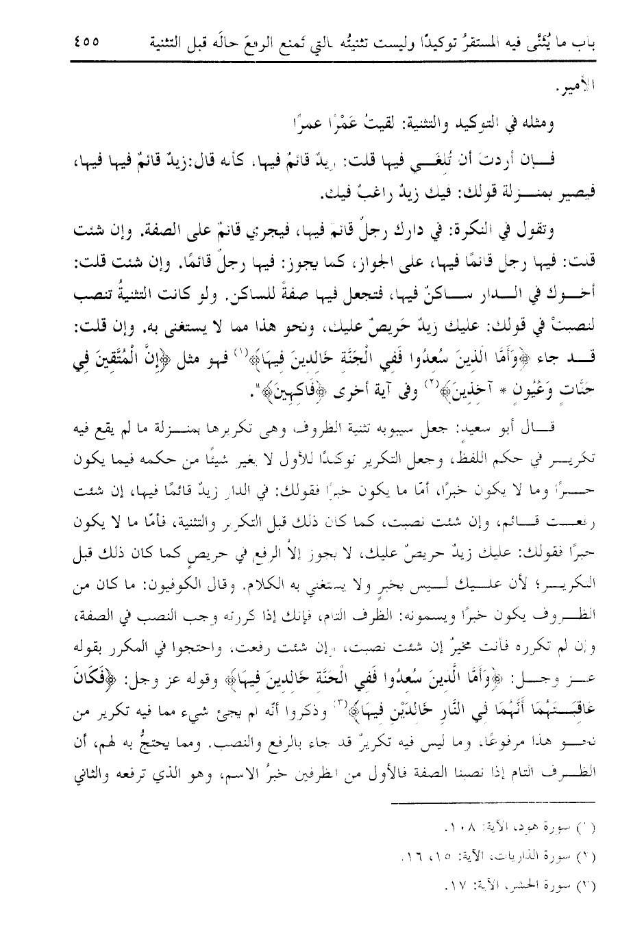 زيد قائما فيها، إن شئت رفعت قائم، وإن شئت نصبت، كما كان ذلك قبل التكرير والتثنية، فأمّا ما لا يكون خبرا فقولك: عليك زيد حريص عليك، لا يجوز إلّا الرفع في حريص كما كان ذلك قبل التكرير؛ لأن عليك ليس بخبر ولا يستغني به الكلام. وقال الكوفيون: ما كان من الظروف يكون خبرا ويسمونه: الظرف التام، فإنك إذا كررته وجب النصب في الصفة، وإن لم تكرره فأنت مخير إن شئت نصبت، وإن شئت رفعت، واحتجوا في المكرر بقوله عز وجل: وَأَمَّا الَّذِينَ سُعِدُوا فَفِي الْجَنَّةِ خالِدِينَ فِيها وقوله عز وجل: فَكانَ عاقِبَتَهُما أَنَّهُما فِي النَّارِ خالِدَيْنِ فِيها (¬3) وذكروا أنّه لم يجئ شيء مما فيه تكرير من نحو هذا مرفوعا، وما ليس فيه تكرير قد جاء بالرفع والنصب. ومما يحتجّ به لهم، أن الظرف التام إذا نصبنا الصفة فالأول من الظرفين خبر الاسم، وهو الذي ترفعه والثاني