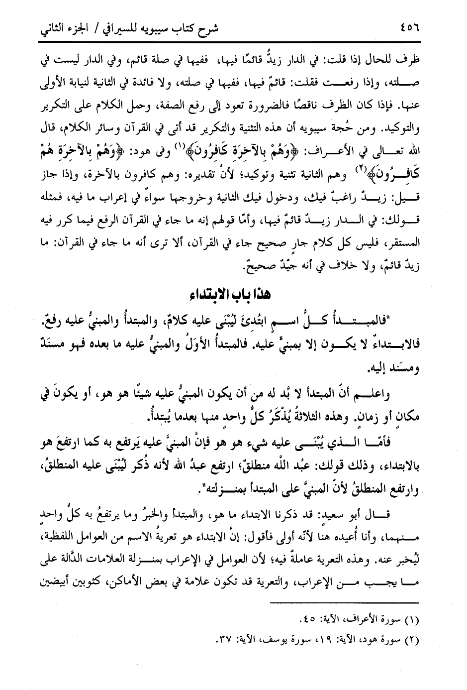 قال أبو سعيد: قد ذكرنا الابتداء ما هو، والمبتدأ والخبر وما يرتفع به كلّ واحد منهما، وأنا أعيده هنا لأنّه أولى فأقول: إنّ الابتداء هو تعرية الاسم من العوامل اللفظية، ليخبر عنه. وهذه التعرية عاملة فيه؛ لأن العوامل في الإعراب بمنزلة العلامات الدّالة على ما يجب من الإعراب، والتعرية قد تكون علامة في بعض الأماكن، كثوبين أبيضين