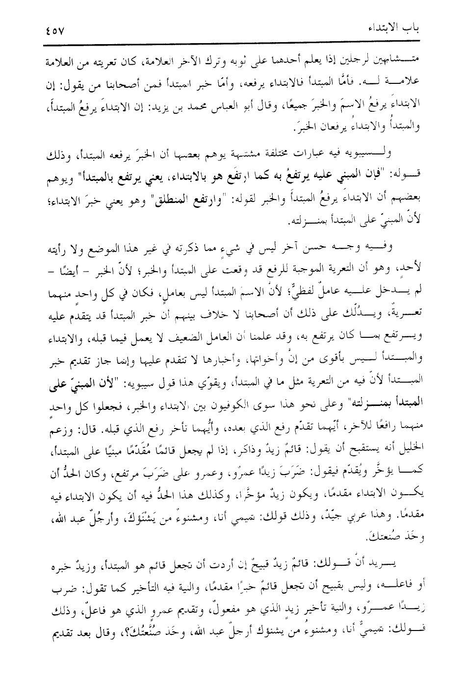متشابهين لرجلين إذا يعلم أحدهما على ثوبه وترك الآخر العلامة، كان تعريته من العلامة علامة له. فأمّا المبتدأ فالابتداء يرفعه، وأمّا خبر المبتدأ فمن أصحابنا من يقول: إن الابتداء يرفع الاسم والخبر جميعا، وقال أبو العباس محمد بن يزيد: إن الابتداء يرفع المبتدأ، والمبتدأ والابتداء يرفعان الخبر.