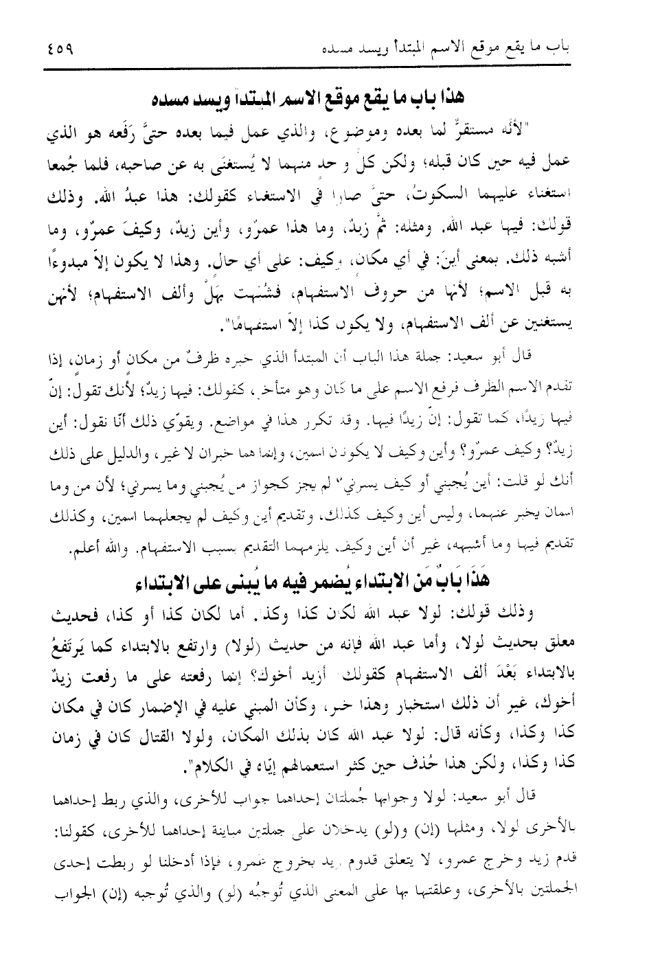 قال أبو سعيد: جملة هذا الباب أن المبتدأ الذي خبره ظرف من مكان أو زمان، إذا تقدم الاسم الظرف فرفع الاسم على ما كان وهو متأخر، كقولك: فيها زيد؛ لأنك تقول: إنّ فيها زيدا، كما تقول: إنّ زيدا فيها. وقد تكرر هذا في مواضع. ويقوّي ذلك أنّا نقول: أين زيد؟ وكيف عمرو؟ وأين وكيف لا يكونان اسمين، وإنما هما خبران لا غير، والدليل على ذلك أنك لو قلت: أين يجبني أو كيف يسرني؟ لم يجز كجواز من يجبني وما يسرني؛ لأن من وما اسمان يخبر عنهما، وليس أين وكيف كذلك، وتقديم أين وكيف لم يجعلهما اسمين، وكذلك تقديم فيها وما أشبهه، غير أن أين وكيف يلزمهما التقديم بسبب الاستفهام. والله أعلم.