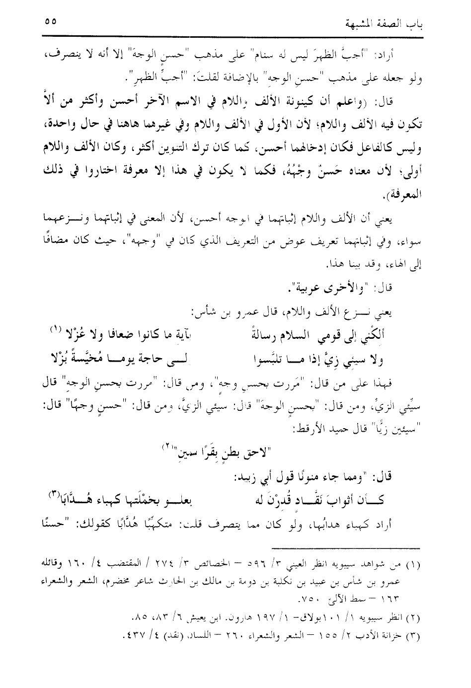فهذا على من قال: " مررت بحسن وجه "، ومن قال: " مررت بحسن الوجه " قال سيّئي الزيّ، ومن قال: " بحسن الوجه " قال: سيئي الزيّ، ومن قال: " حسن وجها " قال: