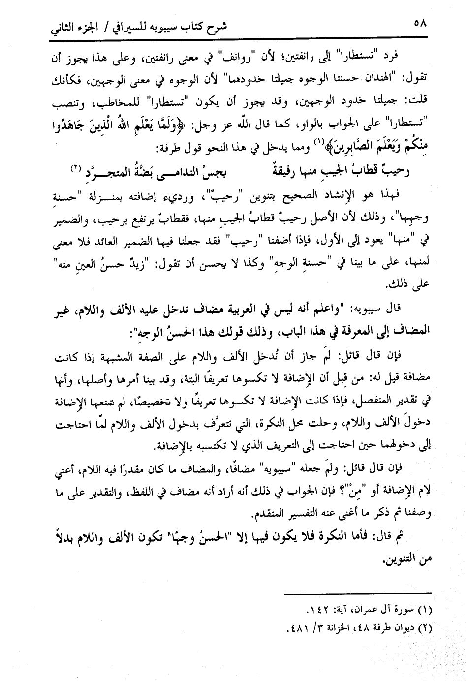 قال سيبويه: " واعلم أنه ليس في العربية مضاف تدخل عليه الألف واللام، غير المضاف إلى المعرفة في هذا الباب، وذلك قولك هذا الحسن الوجه ":