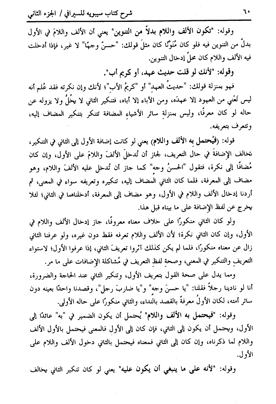 ومما يدل على صحة القول بتعريف الأول، وتنكير الثاني عند الحاجة والضرورة، أنا لو نادينا رجلا فقلنا: " يا حسن وجه " و " يا ضارب رجل "، وقصدنا واحدا بعينه دون سائر أمته، لكان الأول معرفة بالقصد بالنداء، والثاني منكورا على حاله الأولى.