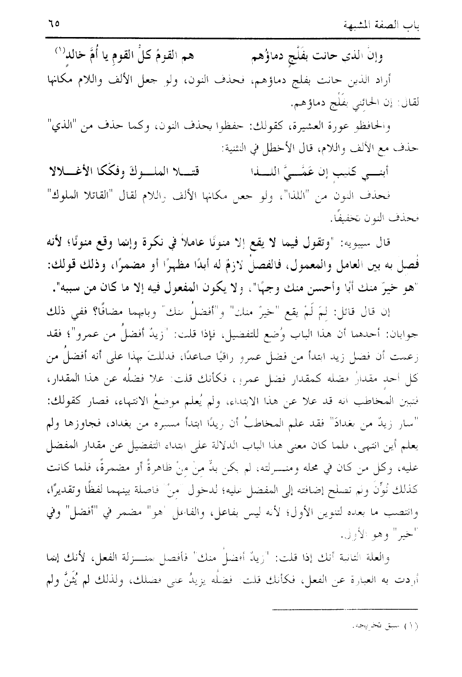 " سار زيد من بغداد " فقد علم المخاطب أن زيدا ابتدأ مسيره من بغداد، فجاوزها ولم يعلم أين انتهى، فلما كان معنى هذا الباب الدلالة على ابتداء التفضيل عن مقدار المفضل عليه، وكل من كان في محله ومنزلته، لم يكن بدّ من من ظاهرة أو مضمرة، فلما كانت كذلك نوّن ولم تصلح إضافته إلى المفضل عليه؛ لدخول " من " فاصلة بينهما لفظا وتقديرا، وانتصب ما بعده لتنوين الأول؛ لأنه ليس بفاعل، والفاعل " هو " مضمر في " أفضل " وفي " خير "