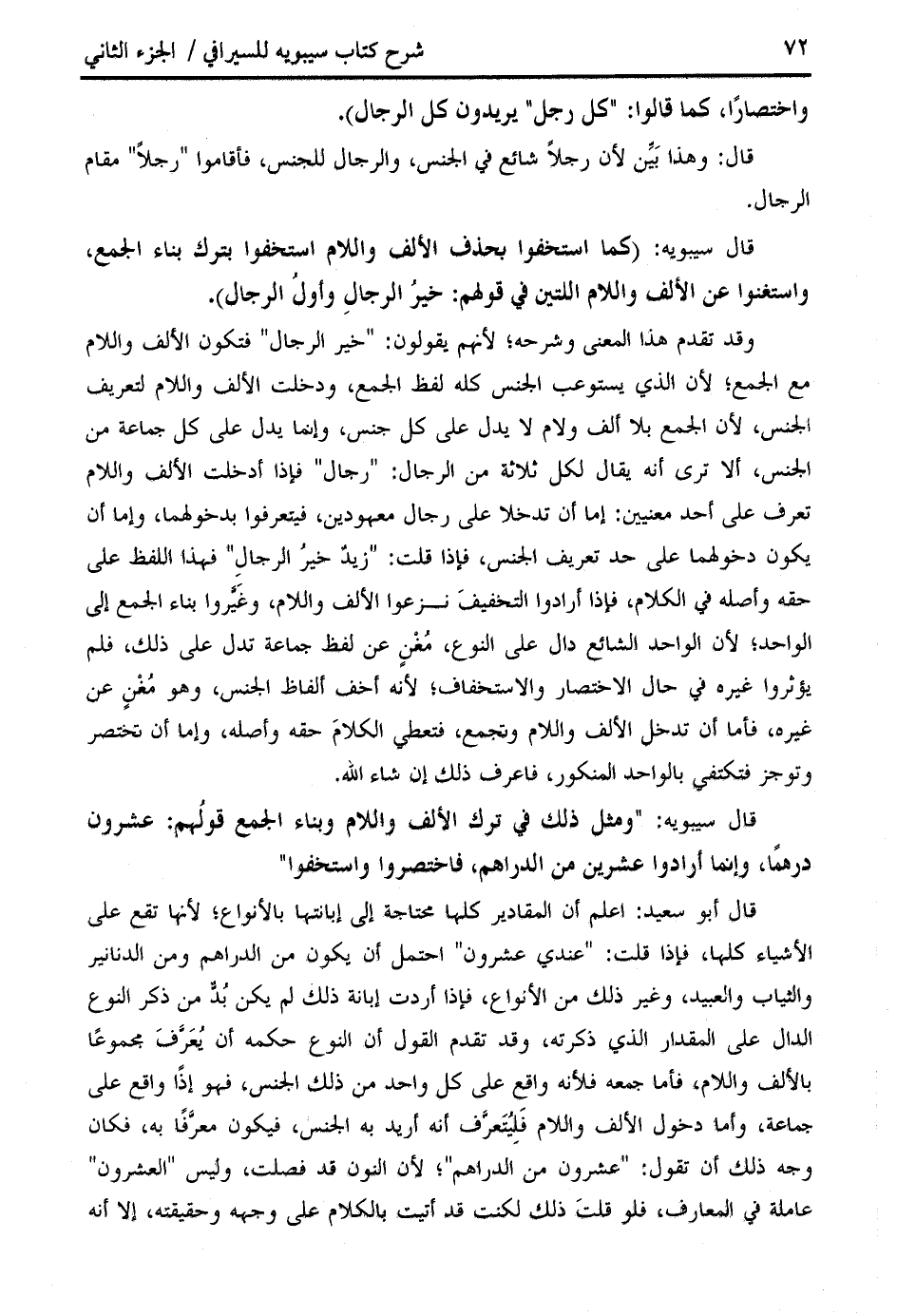قال أبو سعيد: اعلم أن المقادير كلها محتاجة إلى إبانتها بالأنواع؛ لأنها تقع على الأشياء كلها، فإذا قلت: " عندي عشرون " احتمل أن يكون من الدراهم ومن الدنانير والثياب والعبيد، وغير ذلك من الأنواع، فإذا أردت إبانة ذلك لم يكن بدّ من ذكر النوع الدال على المقدار الذي ذكرته، وقد تقدم القول أن النوع حكمه أن يعرّف مجموعا بالألف واللام، فأما جمعه فلأنه واقع على كل واحد من ذلك الجنس، فهو إذا واقع على جماعة، وأما دخول الألف واللام فليتعرّف أنه أريد به الجنس، فيكون معرّفا به، فكان وجه ذلك أن تقول: " عشرون من الدراهم "؛ لأن النون قد فصلت، وليس " العشرون " عاملة في المعارف، فلو قلت ذلك لكنت قد أتيت بالكلام على وجهه وحقيقته، إلا أنه