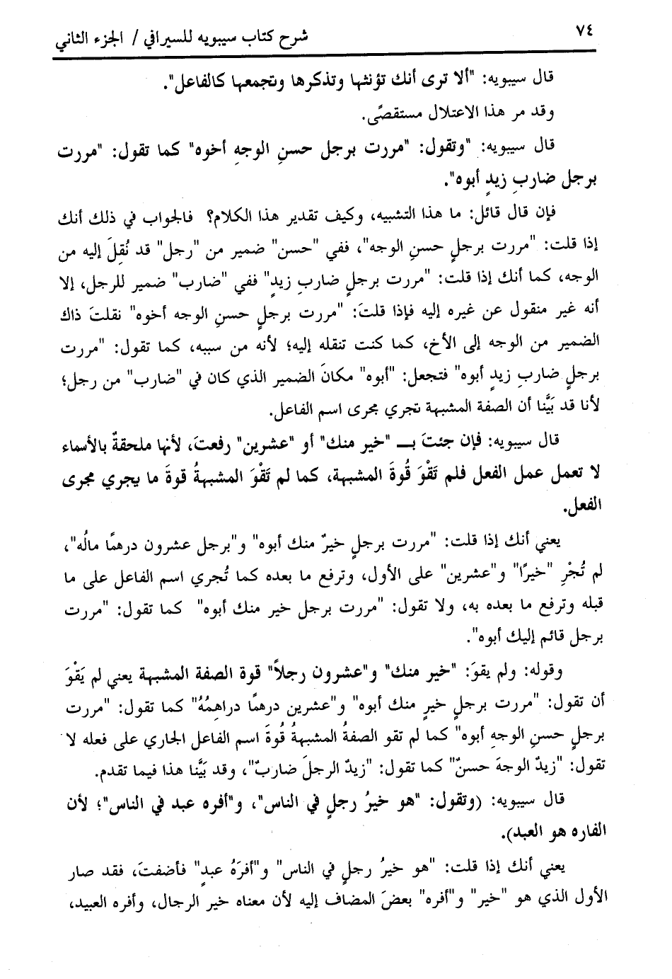 وقوله: ولم يقو: " خير منك " و " عشرون رجلا " قوة الصفة المشبهة يعني لم يقو أن تقول: " مررت برجل خير منك أبوه " و " عشرين درهما دراهمه " كما تقول: " مررت برجل حسن الوجه أبوه " كما لم تقو الصفة المشبهة قوة اسم الفاعل الجاري على فعله لا تقول: " زيد الوجه حسن " كما تقول: " زيد الرجل ضارب "، وقد بيّنا هذا فيما تقدم.