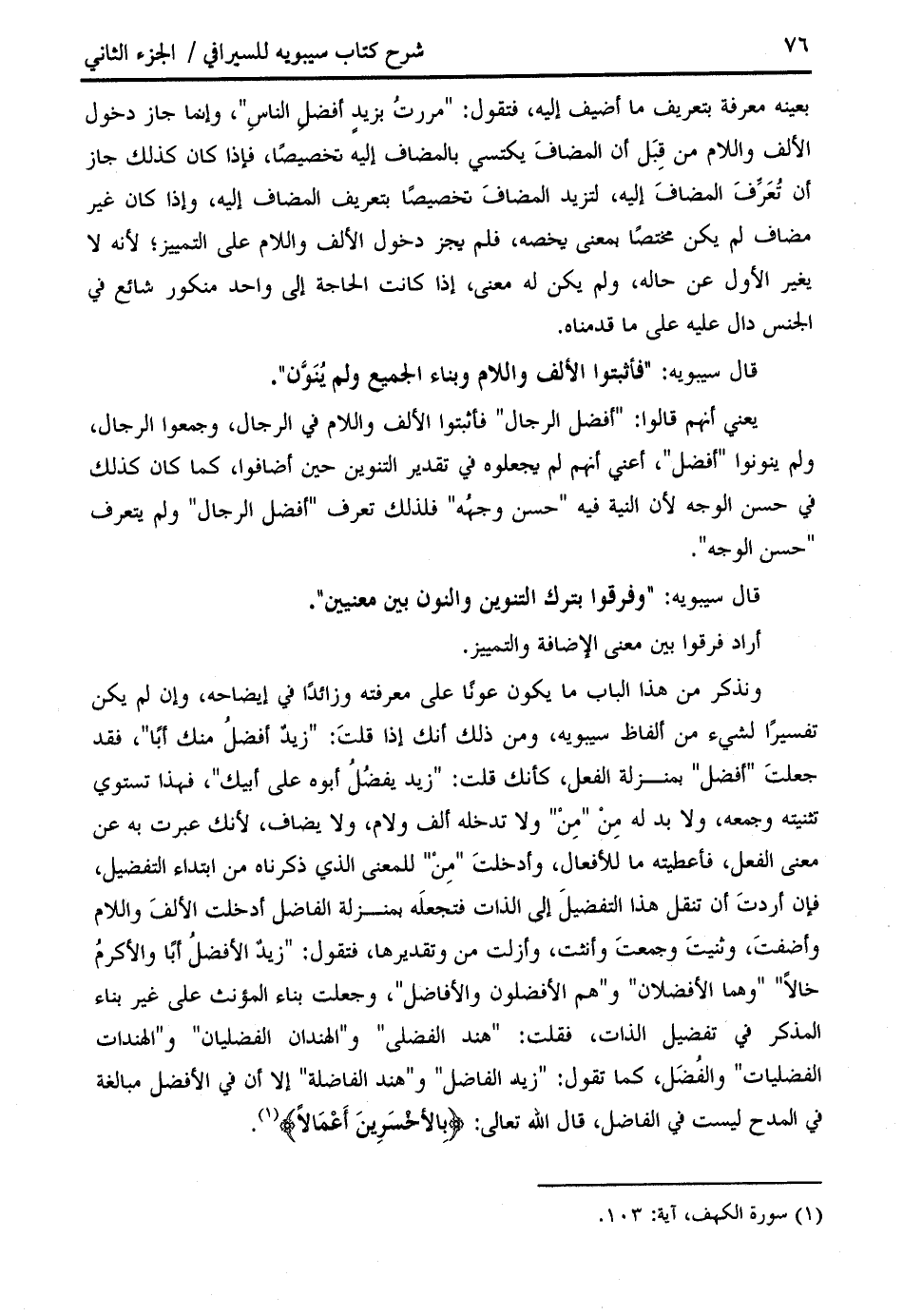 يعني أنهم قالوا: " أفضل الرجال " فأثبتوا الألف واللام في الرجال، وجمعوا الرجال، ولم ينونوا " أفضل "، أعني أنهم لم يجعلوه في تقدير التنوين حين أضافوا، كما كان كذلك في حسن الوجه لأن النية فيه " حسن وجهه " فلذلك تعرف " أفضل الرجال " ولم يتعرف " حسن الوجه ".
