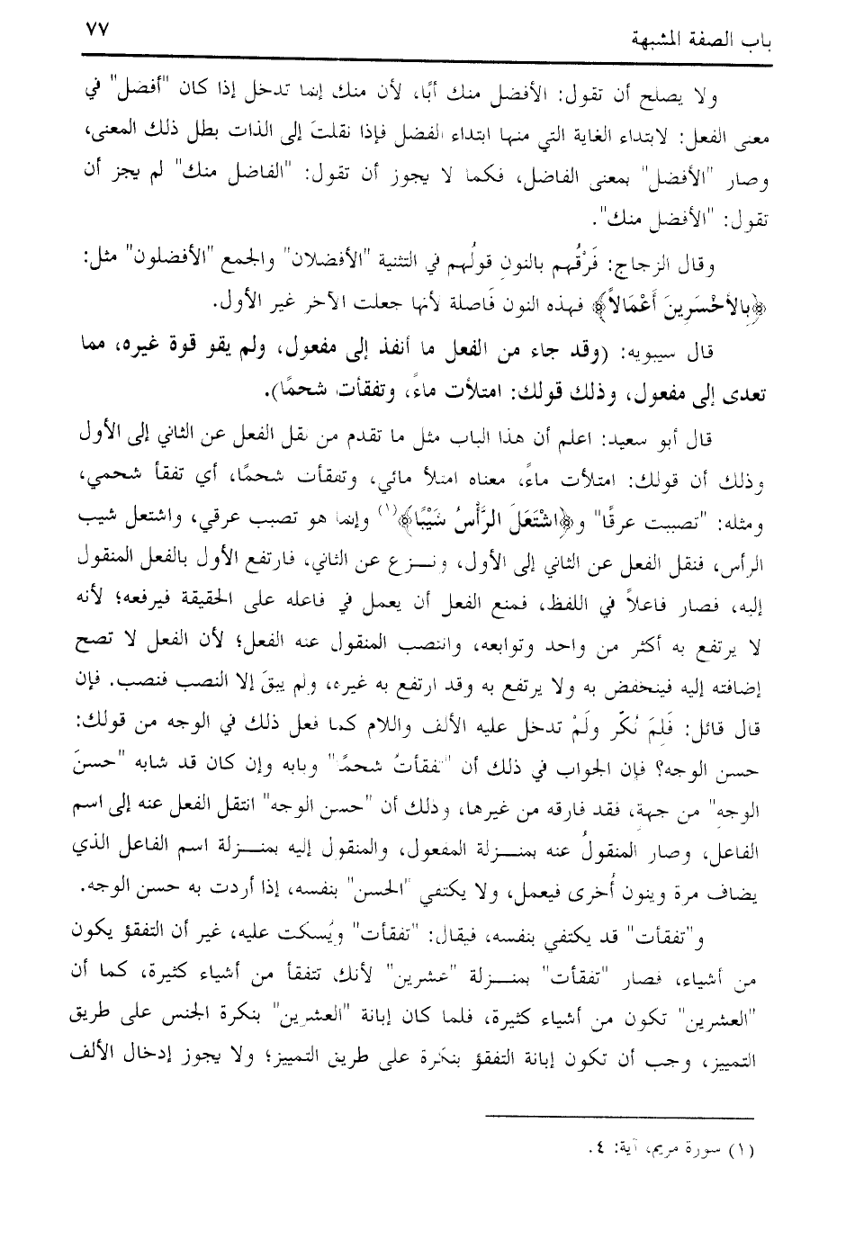 حسن الوجه؟ فإن الجواب في ذلك أن " تفقأت شحما " وبابه وإن كان قد شابه " حسن الوجه " من جهة، فقد فارقه من غيرها، وذلك أن " حسن الوجه " انتقل الفعل عنه إلى اسم الفاعل، وصار المنقول عنه بمنزلة المفعول، والمنقول إليه بمنزلة اسم الفاعل الذي يضاف مرة وينون أخرى فيعمل، ولا يكتفي " الحسن " بنفسه، إذا أردت به حسن الوجه.