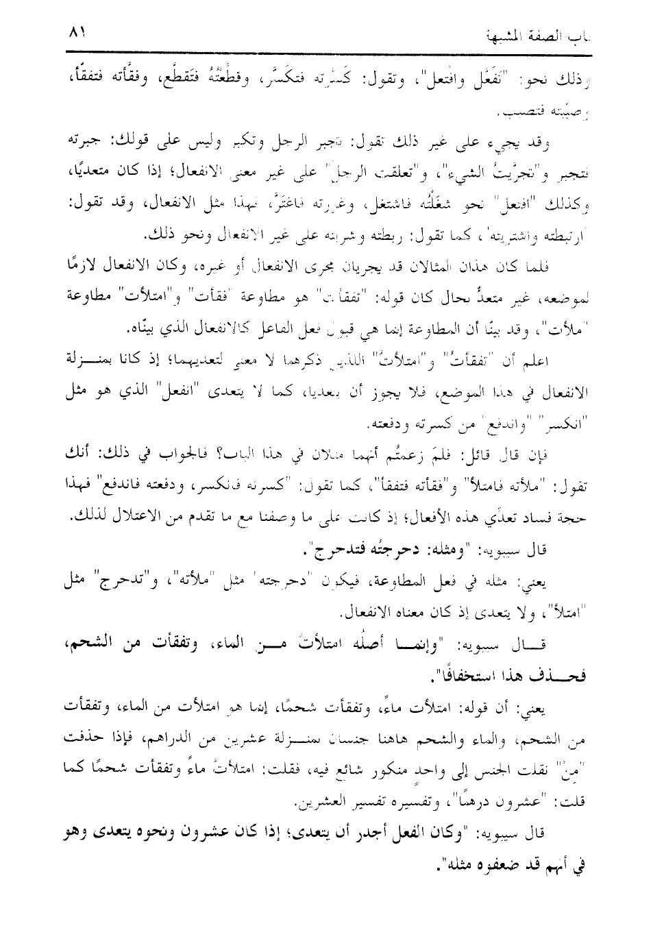 اعلم أن " تفقأت " و " امتلأت " اللذين ذكرهما لا معنى لتعديهما؛ إذ كانا بمنزلة الانفعال في هذا الموضع، فلا يجوز أن يتعديا، كما لا يتعدى " انفعل " الذي هو مثل " انكسر " " واندفع " من كسرته ودفعته.