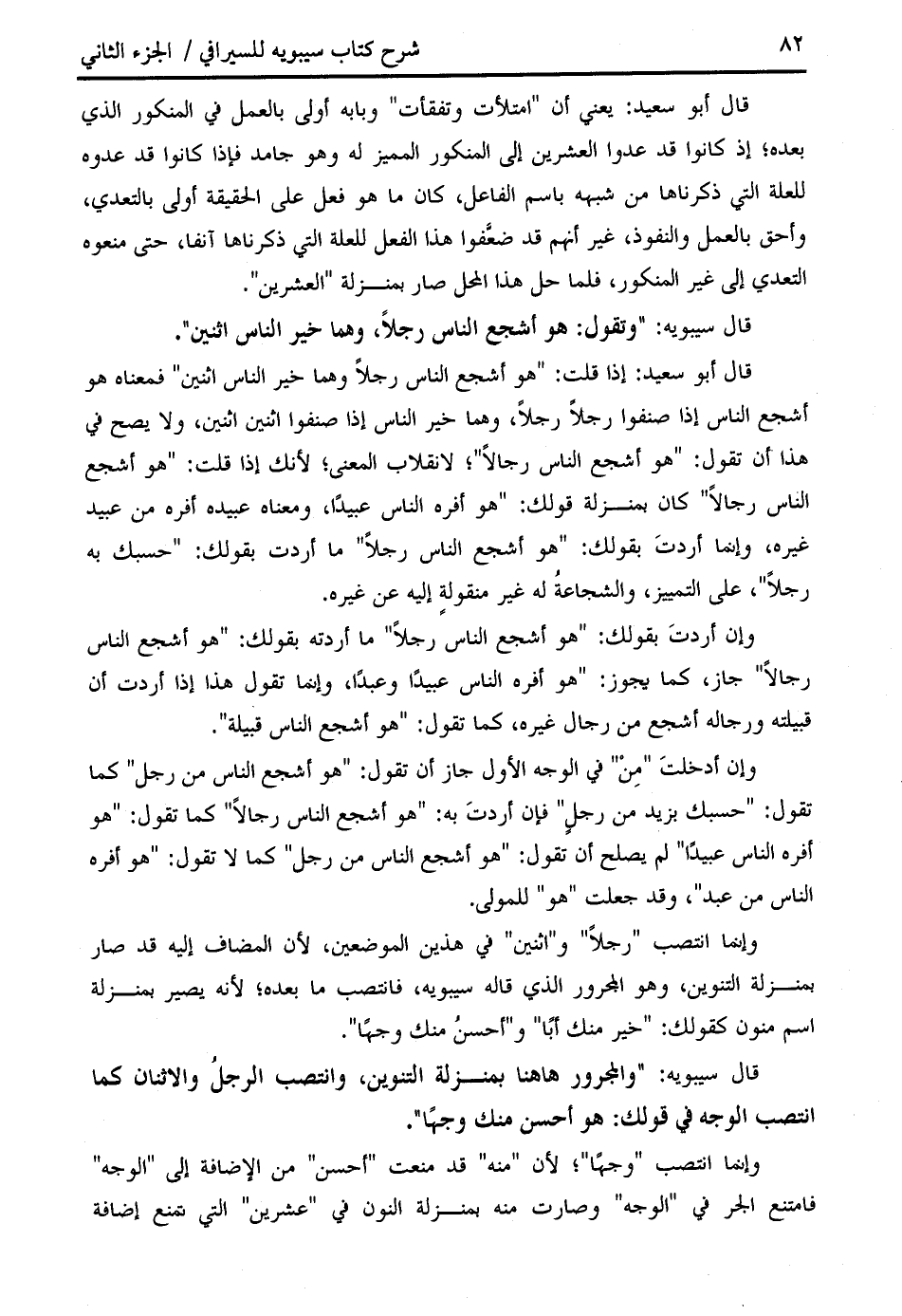 قال أبو سعيد: إذا قلت: " هو أشجع الناس رجلا وهما خير الناس اثنين " فمعناه هو أشجع الناس إذا صنفوا رجلا رجلا، وهما خير الناس إذا صنفوا اثنين اثنين، ولا يصح في هذا أن تقول: " هو أشجع الناس رجالا "؛ لانقلاب المعنى؛ لأنك إذا قلت: " هو أشجع الناس رجالا " كان بمنزلة قولك: " هو أفره الناس عبيدا، ومعناه عبيده أفره من عبيد غيره، وإنما أردت بقولك: " هو أشجع الناس رجلا " ما أردت بقولك: " حسبك به رجلا "، على التمييز،