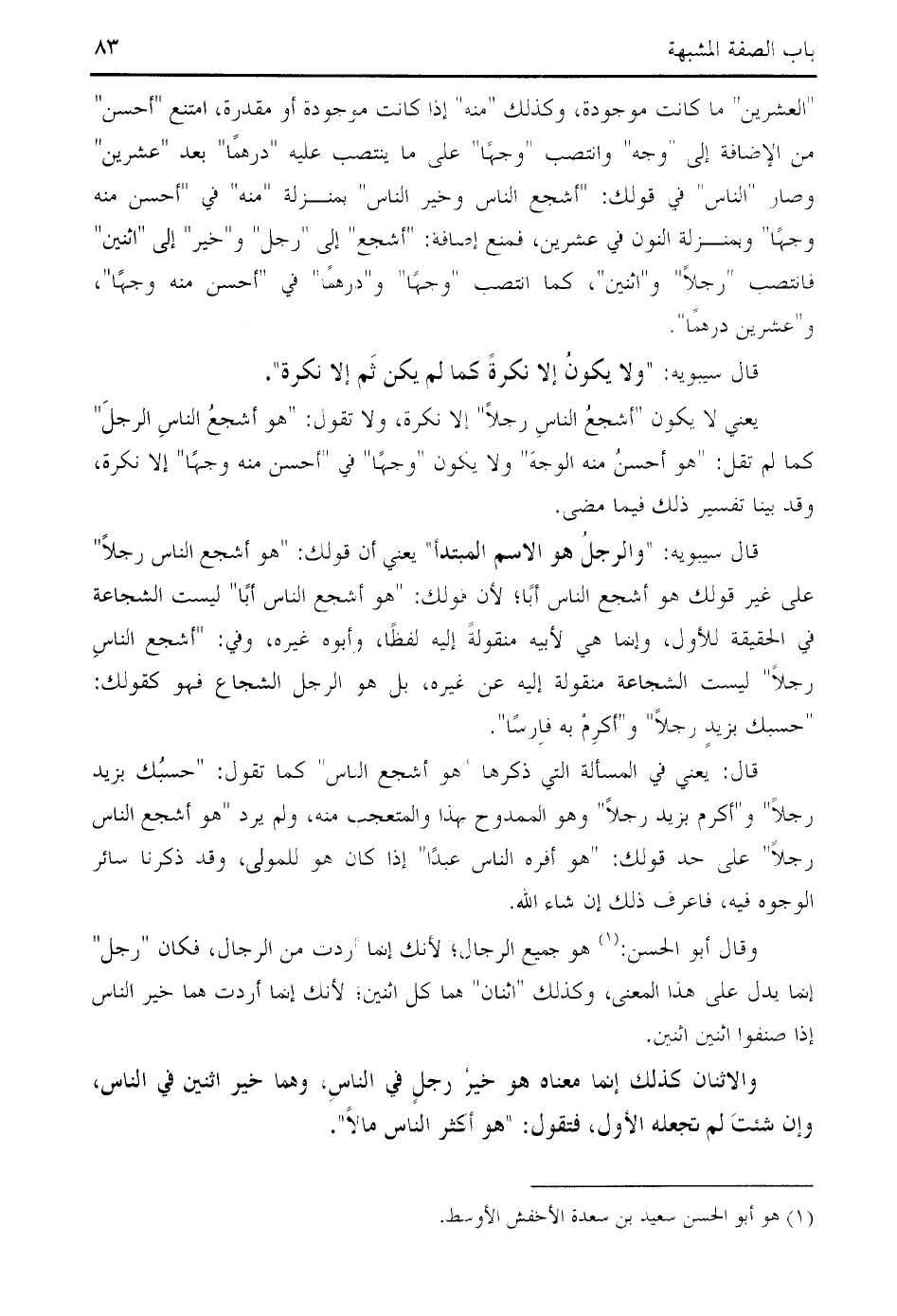 " العشرين " ما كانت موجودة، وكذلك " منه " إذا كانت موجودة أو مقدرة، امتنع " أحسن " من الإضافة إلى " وجه " وانتصب " وجها " على ما ينتصب عليه " درهما " بعد " عشرين " وصار " الناس " في قولك: " أشجع الناس وخير الناس " بمنزلة " منه " في " أحسن منه وجها " وبمنزلة النون في عشرين، فمنع إضافة: " أشجع " إلى " رجل " و " خير " إلى " اثنين " فانتصب " رجلا " و " اثنين "، كما انتصب " وجها " و " درهما " في " أحسن منه وجها "، و " عشرين درهما ".