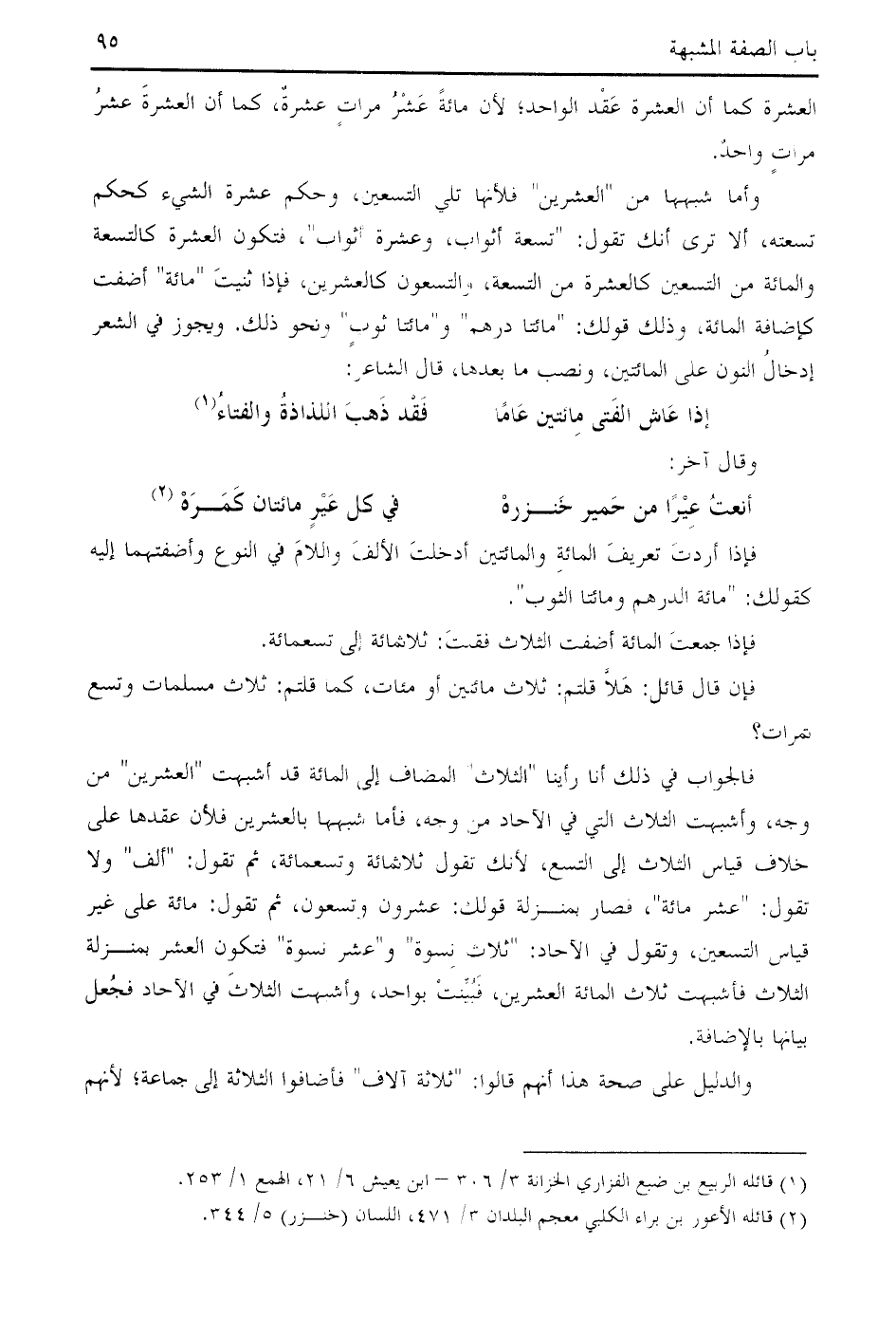 وأما شبهها من " العشرين " فلأنها تلي التسعين، وحكم عشرة الشيء كحكم تسعته، ألا ترى أنك تقول: " تسعة أثواب، وعشرة أثواب "، فتكون العشرة كالتسعة والمائة من التسعين كالعشرة من التسعة، والتسعون كالعشرين، فإذا ثنيت " مائة " أضفت كإضافة المائة، وذلك قولك: " مائتا درهم " و " مائتا ثوب " ونحو ذلك. ويجوز في الشعر إدخال النون على المائتين، ونصب ما بعدها، قال الشاعر: