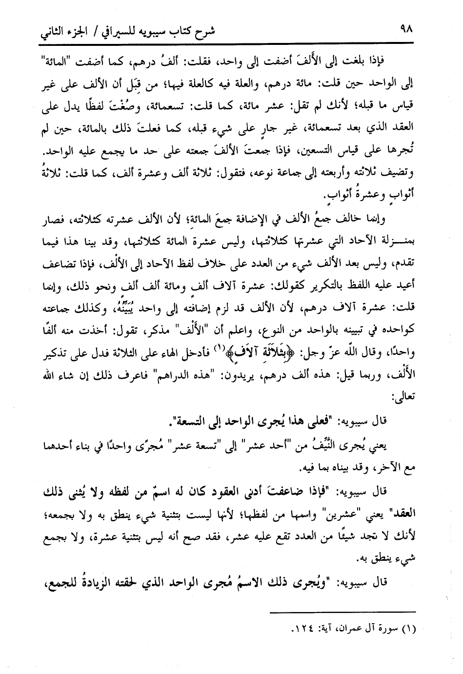 فإذا بلغت إلى الألف أضفت إلى واحد، فقلت: ألف درهم، كما أضفت " المائة " إلى الواحد حين قلت: مائة درهم، والعلة فيه كالعلة فيها؛ من قبل أن الألف على غير قياس ما قبله؛ لأنك لم تقل: عشر مائة، كما قلت: تسعمائة، وصغت لفظا يدل على العقد الذي بعد تسعمائة، غير جار على شيء قبله، كما فعلت ذلك بالمائة، حين لم تجرها على قياس التسعين، فإذا جمعت الألف جمعته على حد ما يجمع عليه الواحد.