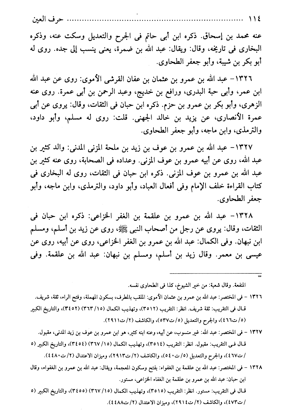 1326 - عبد الله بن عمرو بن عثمان بن عفان القرشى الأموى: روى عن عبد الله ابن عمر، وأبى حبة البدرى، ورافع بن خديج، وعبد الرحمن بن أبى عمرة. روى عنه الزهرى، وأبو بكر بن عمرو بن حزم. ذكره ابن حبان فى الثقات، وقال: يروى عن أبى عمرة الأنصارى، عن يزيد بن خالد الجهنى. قلت: روى له مسلم، وأبو داود، والترمذى، وابن ماجه، وأبو جعفر الطحاوى.