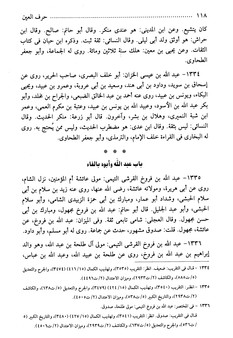 1336 - عبد الله بن فروخ القرشى التيمى: مولى آل طلحة بن عبد الله، وهو والد إبراهيم بن عبد الله بن فروخ، روى عن طلحة بن عبيد الله، وعبد الله بن عباس،