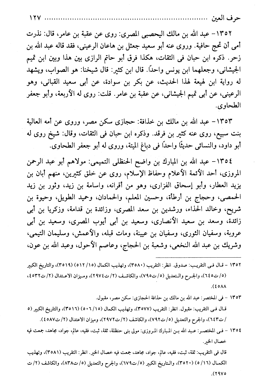 1354 - عبد الله بن المبارك بن واضح الحنظلى التميمى: مولاهم أبو عبد الرحمن المروزى، أحد الأئمة الأعلام وحفاظ الإسلام، روى عن خلق كثيرين، منهم أبان بن يزيد العطار، وأبو إسحاق الفزارى، وهو من أقرانه، واسامة بن زيد، وثور بن زيد الحمصى، وحجاج بن أرطأة، وحسين المعلم، والحمادان، وحميد الطويل، وحيوة بن شريح، وخالد الحذاء، ورشدين بن سعد المصرى، وزائدة بن قدامة، وزكريا بن أبى زائدة، وسعد بن سعيد الأنصارى، وسعيد بن أبى أيوب المصرى، وسعيد بن أبى عروبة، وسفيان الثورى، وسفيان بن عيينة، ومات قبله، والأعمش، وسليمان التيمى، وشريك بن عبد الله النخعى، وشعبة بن الحجاج، وعاصم الأحول، وعبد الله بن عون،