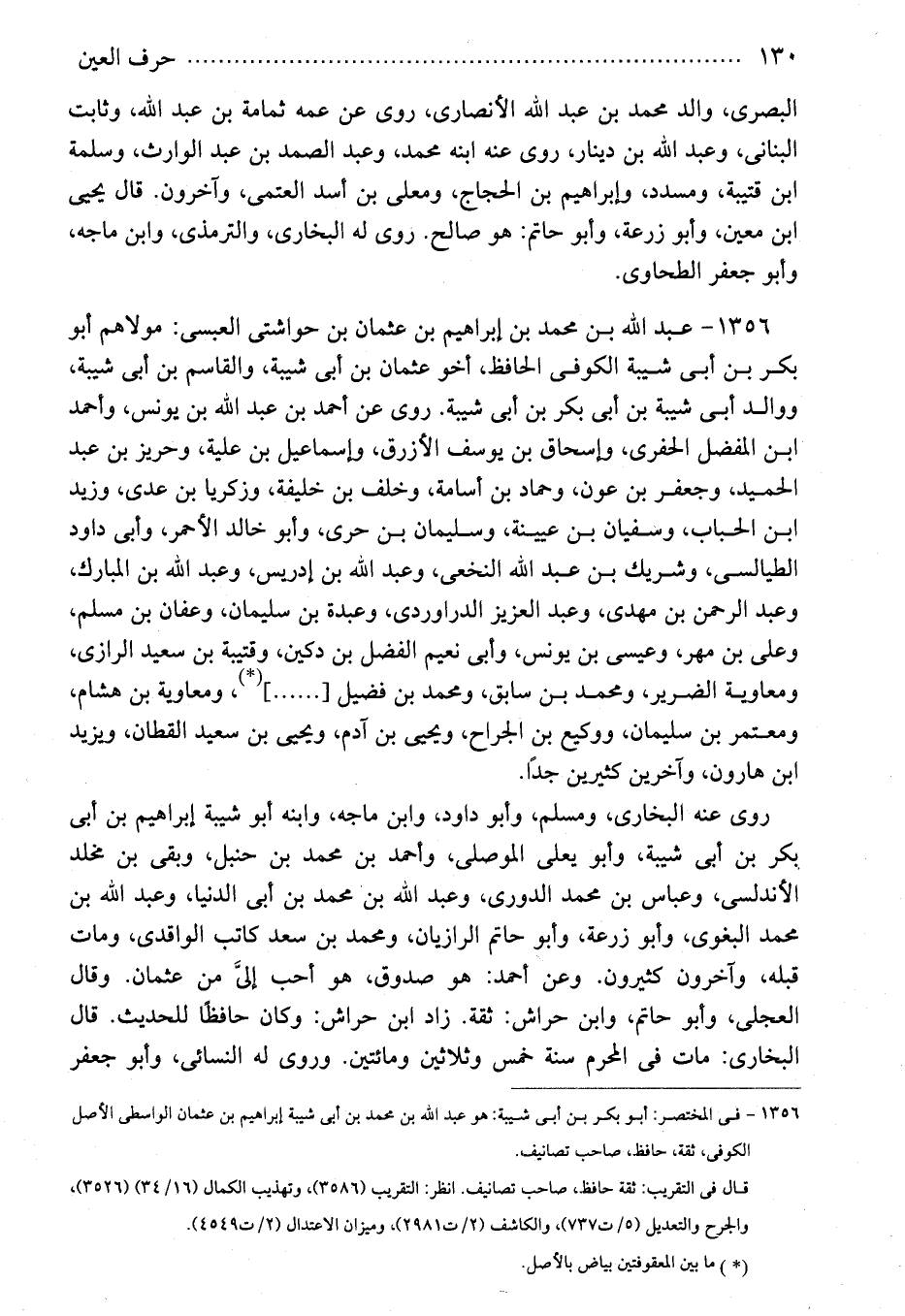 1356 - فى المختصر: أبو بكر بن أبى شيبة: هو عبد الله بن محمد بن أبى شيبة إبراهيم بن عثمان الواسطى الأصل الكوفى، ثقة، حافظ، صاحب تصانيف.