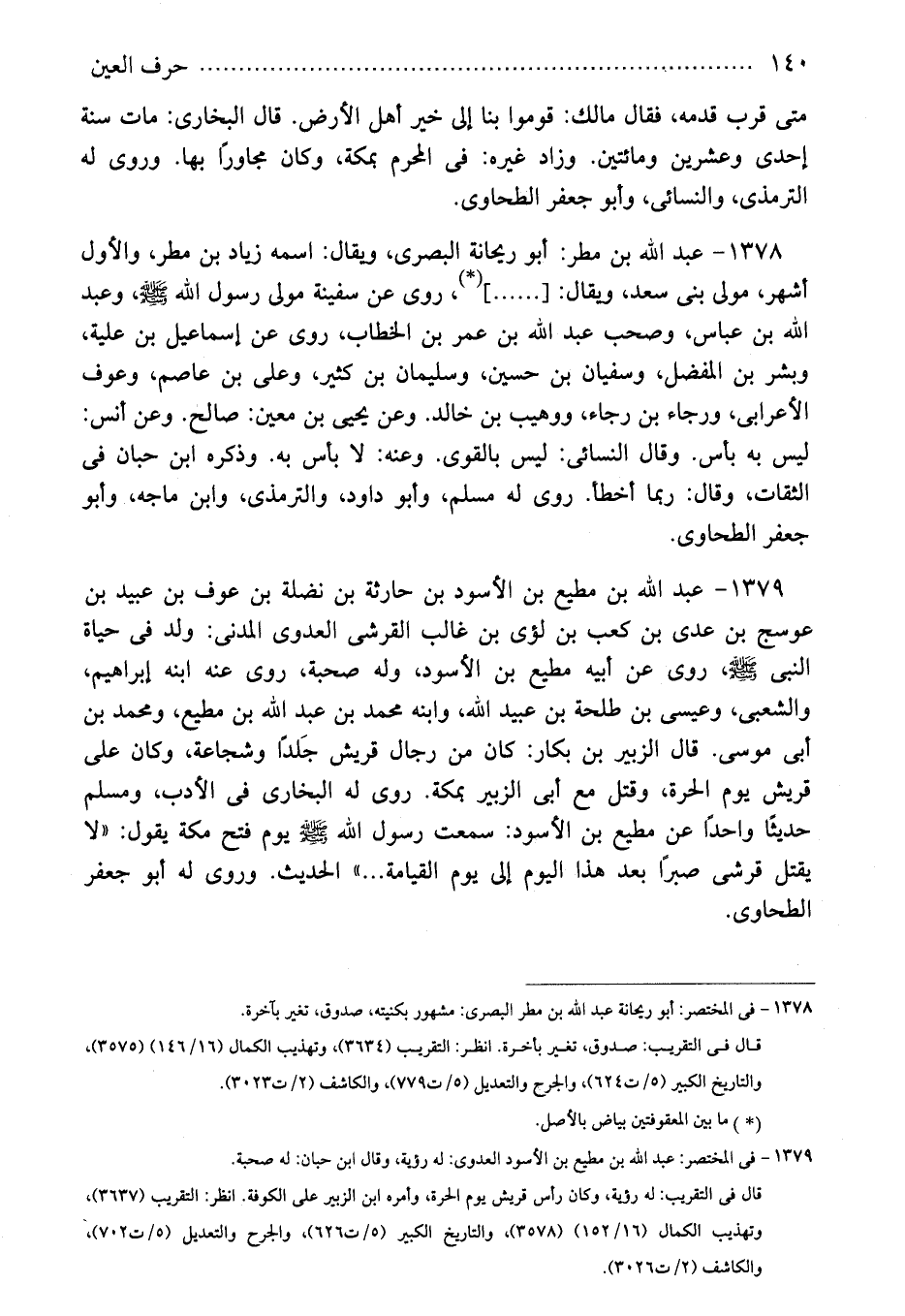 1379 - عبد الله بن مطيع بن الأسود بن حارثة بن نضلة بن عوف بن عبيد بن عوسج بن عدى بن كعب بن لؤى بن غالب القرشى العدوى المدنى: ولد فى حياة النبى - صلى الله عليه وسلم -، روى عن أبيه مطيع بن الأسود، وله صحبة، روى عنه ابنه إبراهيم، والشعبى، وعيسى بن طلحة بن عبيد الله، وابنه محمد بن عبد الله بن مطيع، ومحمد بن أبى موسى. قال الزبير بن بكار: كان من رجال قريش جَلدًا وشجاعة، وكان على قريش يوم الحرة، وقتل مع أبى الزبير بمكة. روى له البخارى فى الأدب، ومسلم حديثًا واحدًا عن مطيع بن الأسود: سمعت رسول الله - صلى الله عليه وسلم - يوم فتح مكة يقول: "لا يقتل قرشى صبرًا بعد هذا اليوم إلى يوم القيامة ... " الحديث. وروى له أبو جعفر الطحاوى.