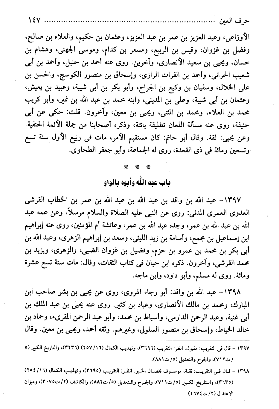 1397 - عبد الله بن واقد بن عبد الله بن عبد الله بن عمر بن الخطاب القرشى العدوى العمرى المدنى: روى عن النبى عليه الصلاة والسلام مرسلاً، وعن عمه عبد الله بن عبد الله بن عمر، وجده عبد الله بن عمر، وعائشة أم المؤمنين، روى عنه إبراهيم ابن إسماعيل بن مجمع، وأسامة بن زيد الليثى، وسعد بن إبراهيم الزهرى، وعبد الله بن أبى بكر بن محمد بن عمرو بن حزم، وفضيل بن غزوان الضبى، والزهرى، ويزيد بن محمد القرشى، وآخرون. ذكره ابن حبان فى كتاب الثقات، وقال: مات سنة تسع عشرة ومائة. روى له مسلم، وأبو داود، وابن ماجه.