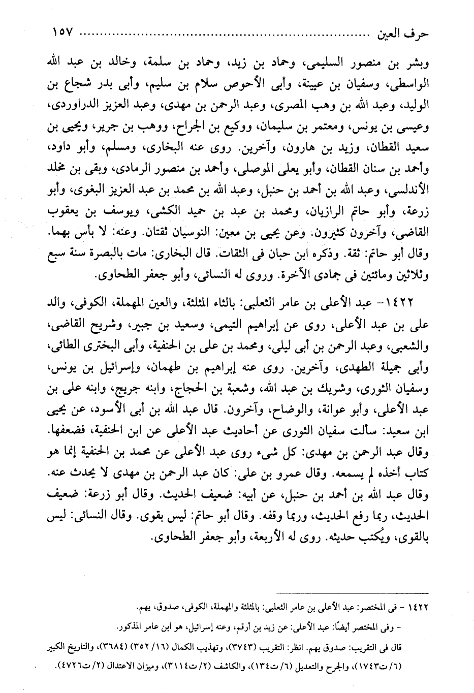 1422 - عبد الأعلى بن عامر الثعلبى: بالثاء المثلثة، والعين المهملة، الكوفى، والد على بن عبد الأعلى، روى عن إبراهيم التيمى، وسعيد بن جبير، وشريح القاضى، والشعبى، وعبد الرحمن بن أبى ليلى، ومحمد بن على بن الحنفية، وأبى البخترى الطائى، وأبى جميلة الطهدى، وآخرين. روى عنه إبراهيم بن طهمان، وإسرائيل بن يونس، وسفيان الثورى، وشريك بن عبد الله، وشعبة بن الحجاج، وابنه جريج، وابنه على بن عبد الأعلى، وأبو عوانة، والوضاح، وآخرون. قال عبد الله بن أبى الأسود، عن يحيى ابن سعيد: سألت سفيان الثورى عن أحاديث عبد الأعلى عن ابن الحنفية، فضعفها. وقال عبد الرحمن بن مهدى: كل شىء روى عبد الأعلى عن محمد بن الحنفية إنما هو كتاب أخذه لم يسمعه. وقال عمرو بن على: كان عبد الرحمن بن مهدى لا يحدث عنه. وقال عبد الله بن أحمد بن حنبل، عن أبيه: ضعيف الحديث. وقال أبو زرعة: ضعيف الحديث، ربما رفع الحديث، وربما وقفه. وقال أبو حاتم: ليس بقوى. وقال النسائى: ليس بالقوى، ويُكتب حديثه. روى له الأربعة، وأبو جعفر الطحاوى.