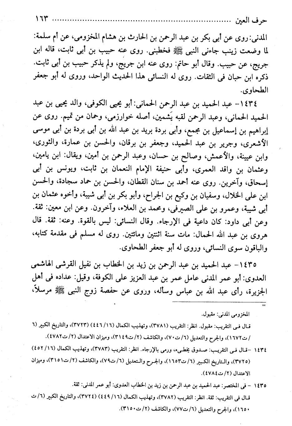 1435 - عبد الحميد بن عبد الرحمن بن زيد بن الخطاب بن نفيل القرشى الهاشمى العدوى: أبو عمر المدنى عامل عمر بن عبد العزيز على الكوفة، وقيل: عداده فى أهل الجزيرة، رأى عبد الله بن عباس وسأله، وروى عن حفصة زوج النبى - صلى الله عليه وسلم - مرسلاً،