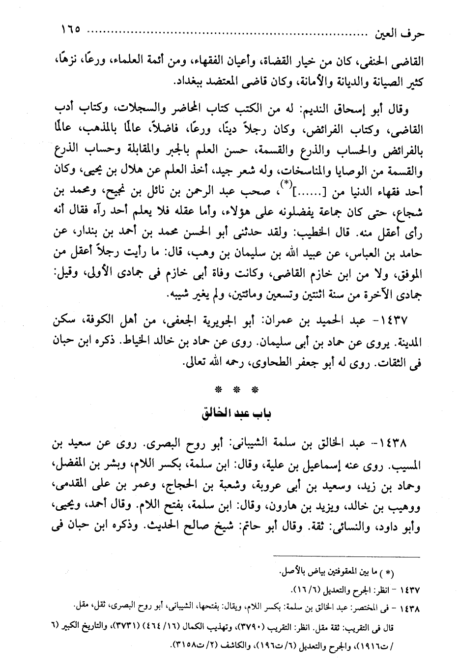 1438 - فى المختصر: عبد الخالق بن سلمة: بكسر اللام، ويقال: بفتحها، الشيبانى، أبو روح البصرى، ثقل، مقل.