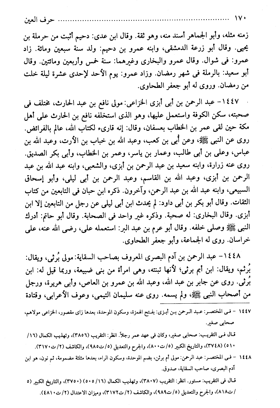 1448 - فى المختصر: عبد الرحمن: مولى أم برثن، بضم الموحدة، وسكون الراء، بعدها مثلثة مضمومة، ثم نون، هو ابن آدم البصرى، صاحب السقاية، صدوق.