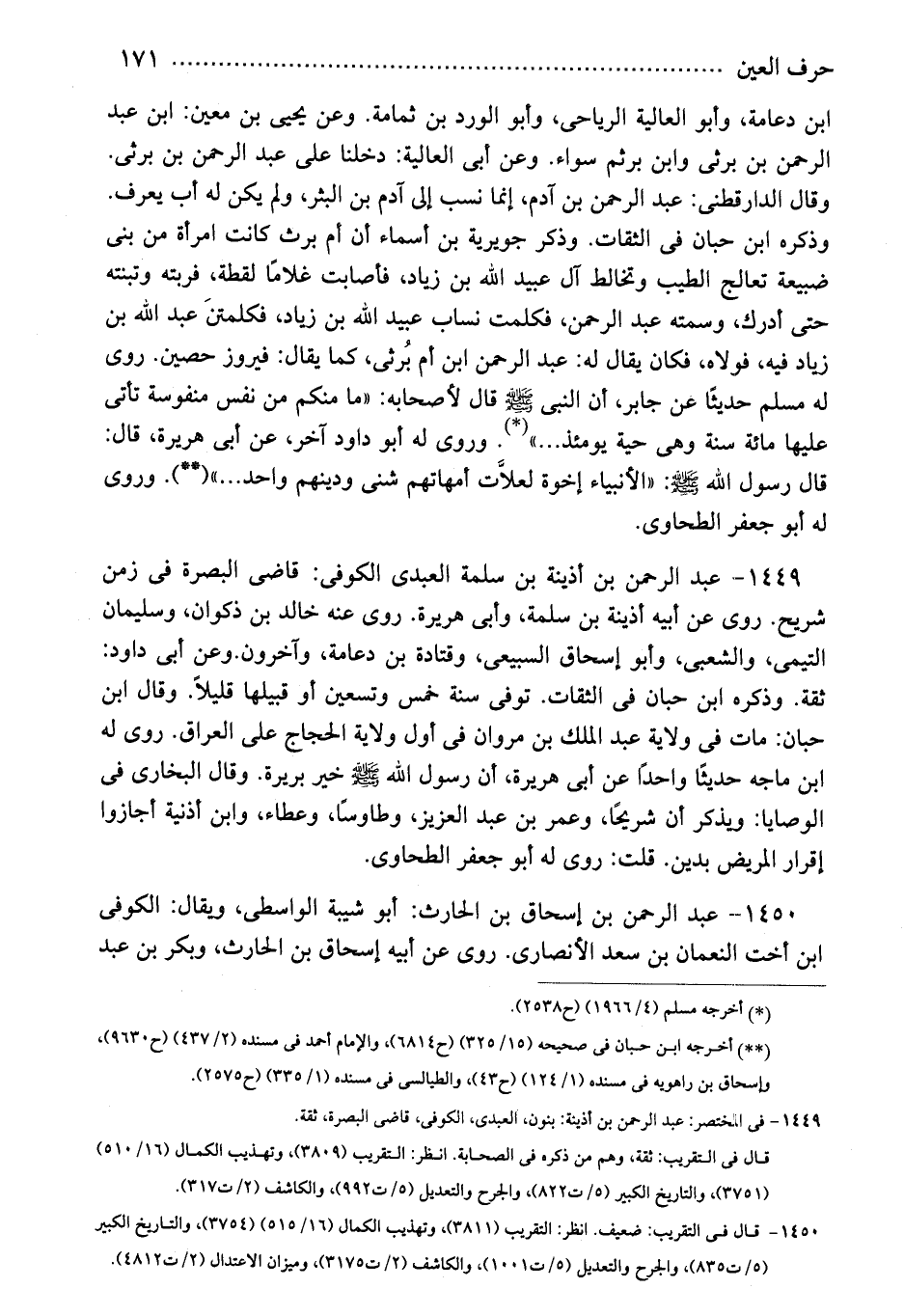 1449 - فى المختصر: عبد الرحمن بن أذينة: بنون، العبدى، الكوفى، قاضى البصرة، ثقة.