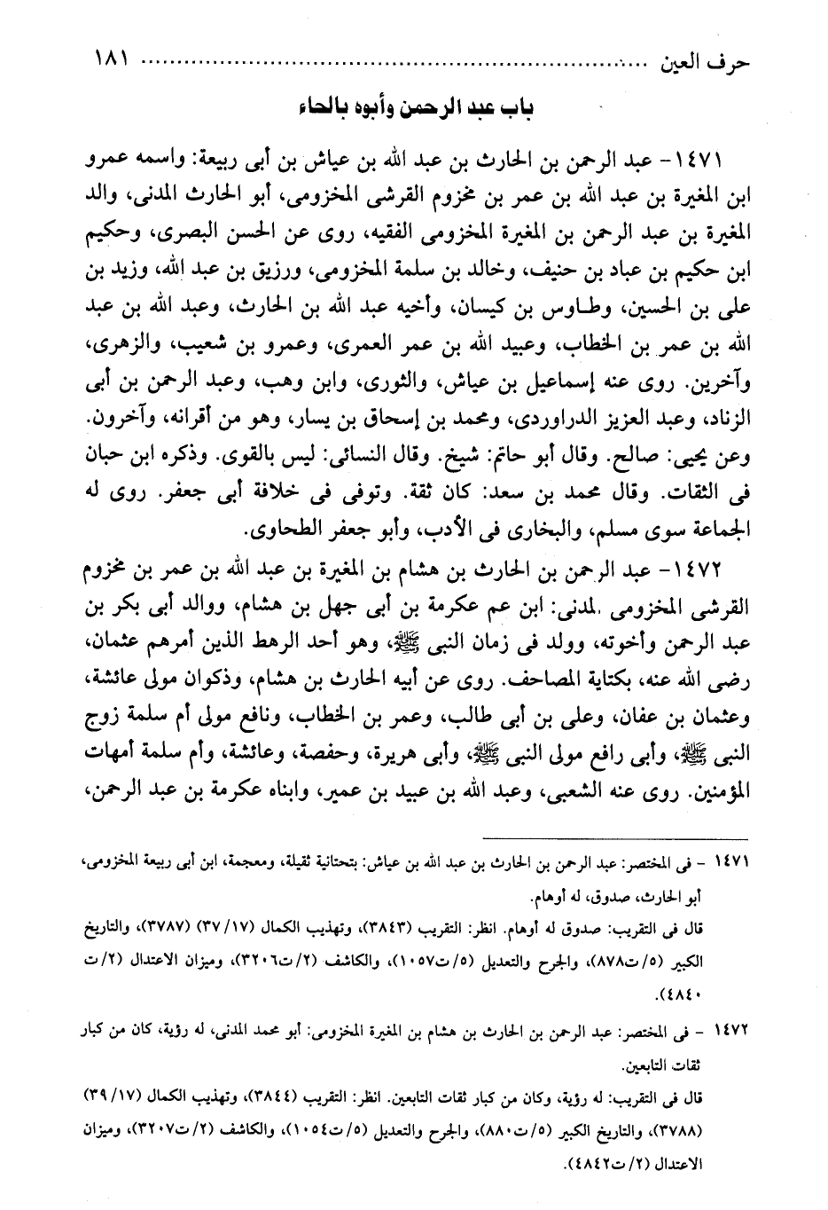 1472 - فى المختصر: عبد الرحمن بن الحارث بن هشام بن المغيرة المخزومى: أبو محمد المدنى، له رؤية، كان من كبار ثقات التابعين.