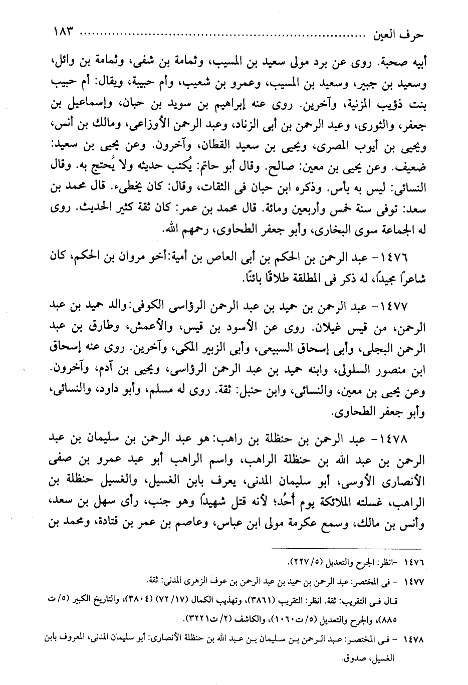 1477 - عبد الرحمن بن حميد بن عبد الرحمن الرؤاسى الكوفى: والد حميد بن عبد الرحمن، من قيس غيلان. روى عن الأسود بن قيس، والأعمش، وطارق بن عبد الرحمن البجلى، وأبى إسحاق السبيعى، وأبى الزبير المكى، وآخرين. روى عنه إسحاق ابن منصور السلولى، وابنه حميد بن عبد الرحمن الرؤاسى، ويحيى بن آدم، وآخرون. وعن يحيى بن معين، والنسائى، وابن حنبل: ثقة. روى له مسلم، وأبو داود، والنسائى، وأبو جعفر الطحاوى.