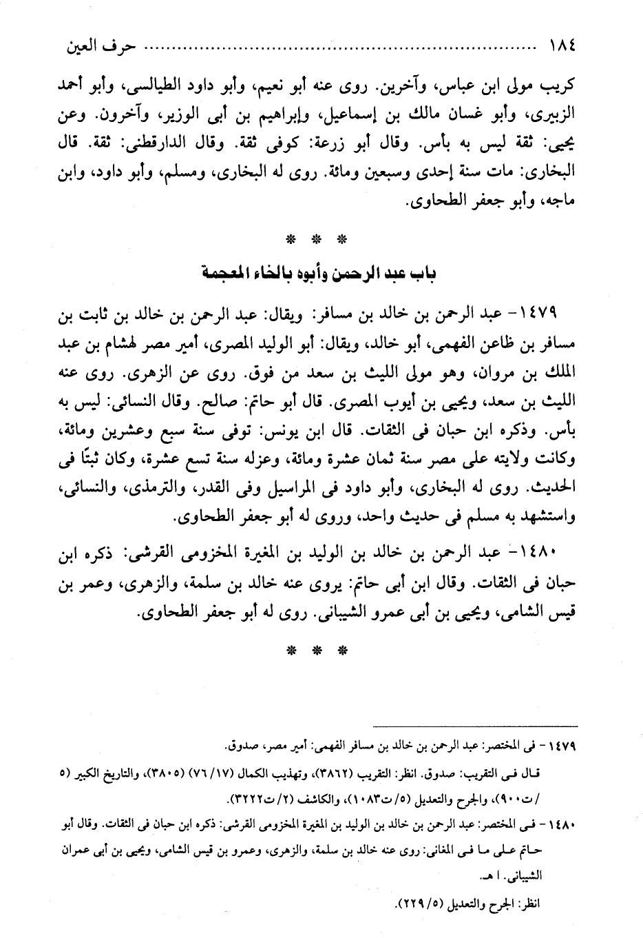 1479 - عبد الرحمن بن خالد بن مسافر: ويقال: عبد الرحمن بن خالد بن ثابت بن مسافر بن ظاعن الفهمى، أبو خالد، ويقال: أبو الوليد المصرى، أمير مصر لهشام بن عبد الملك بن مروان، وهو مولى الليث بن سعد من فوق. روى عن الزهرى. روى عنه الليث بن سعد، ويحيى بن أيوب المصرى. قال أبو حاتم: صالح. وقال النسائى: ليس به بأس. وذكره ابن حبان فى الثقات. قال ابن يونس: توفى سنة سبع وعشرين ومائة، وكانت ولايته على مصر سنة ثمان عشرو ومائة، وعزله سنة تسع عشرة، وكان ثبتًا فى الحديث. روى له البخارى، وأبو داود فى المراسيل وفى القدر، والترمذى، والنسائى، واستشهد به مسلم فى حديث واحد، وروى له أبو جعفر الطحاوى.