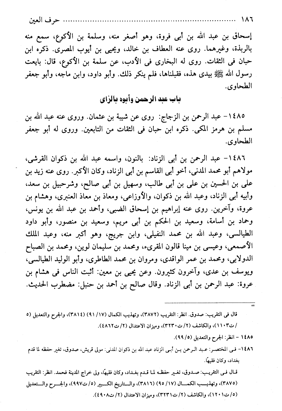 1486 - فى المختصر: عبد الرحمن بن أبى الزناد عبد الله بن ذكوان المدنى: مولى قريش، صدوق، تغير حفظه لما قدم بغداد، وكان فقيهًا.