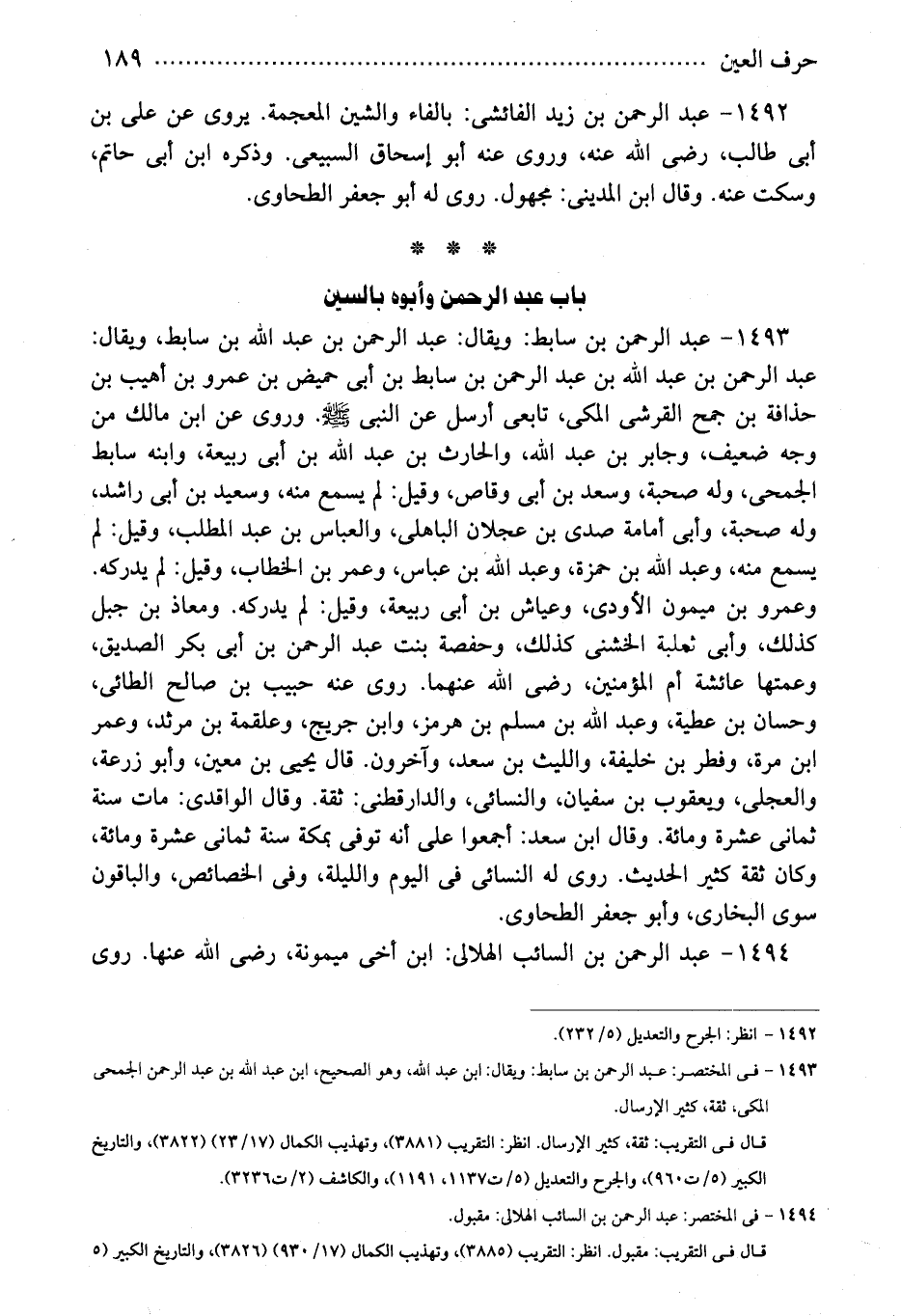 1492 - عبد الرحمن بن زيد الفائشى: بالفاء والشين المعجمة. يروى عن على بن أبى طالب، رضى الله عنه، وروى عنه أبو إسحاق السبيعى. وذكره ابن أبى حاتم، وسكت عنه. وقال ابن المدينى: مجهول. روى له أبو جعفر الطحاوى.