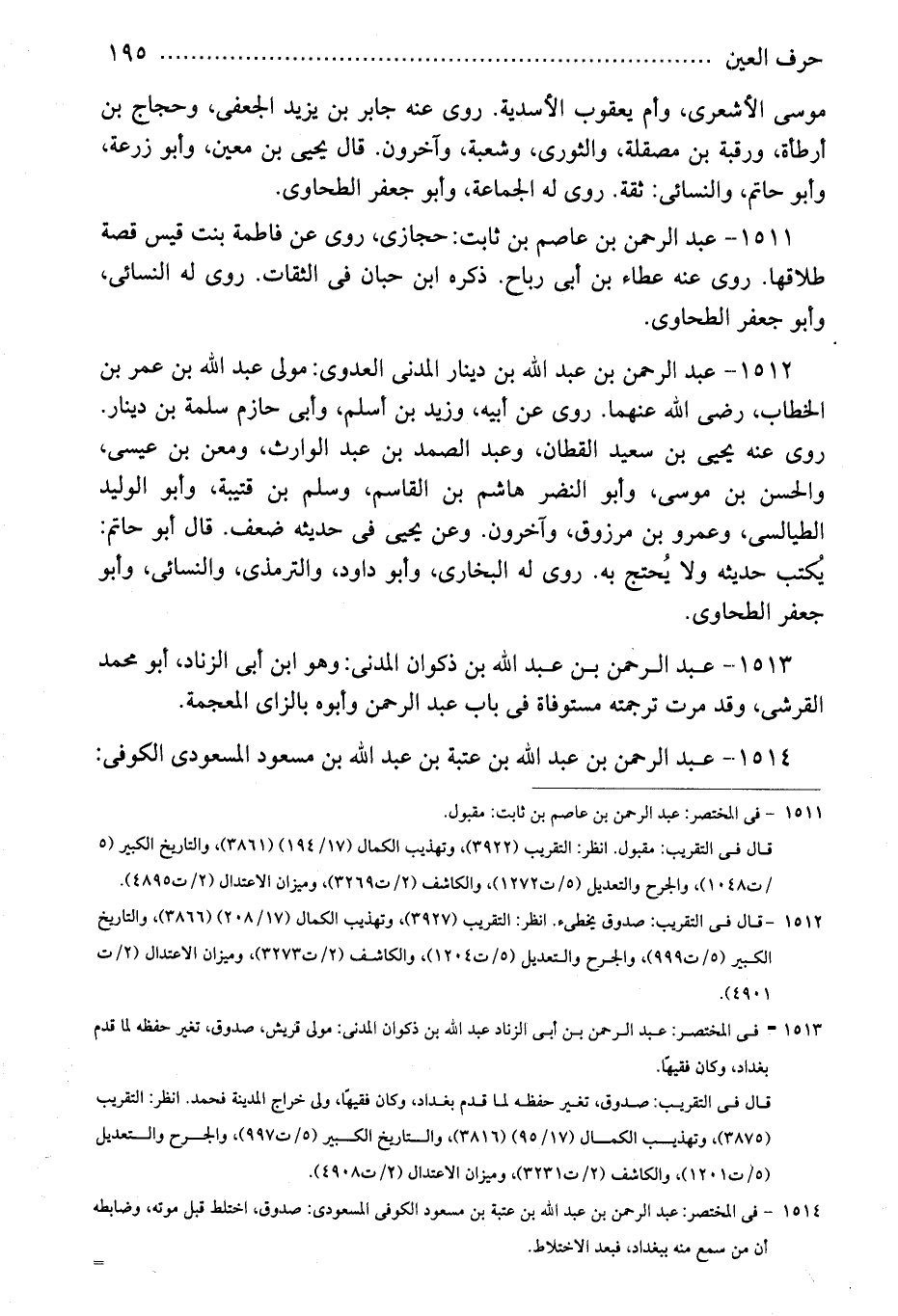 1514 - فى المختصر: عبد الرحمن بن عبد الله بن عتبة بن مسعود الكوفى المسعودى: صدوق، اختلط قبل موته، وضابطه أن من سمع منه ببغداد، فبعد الاختلاط.