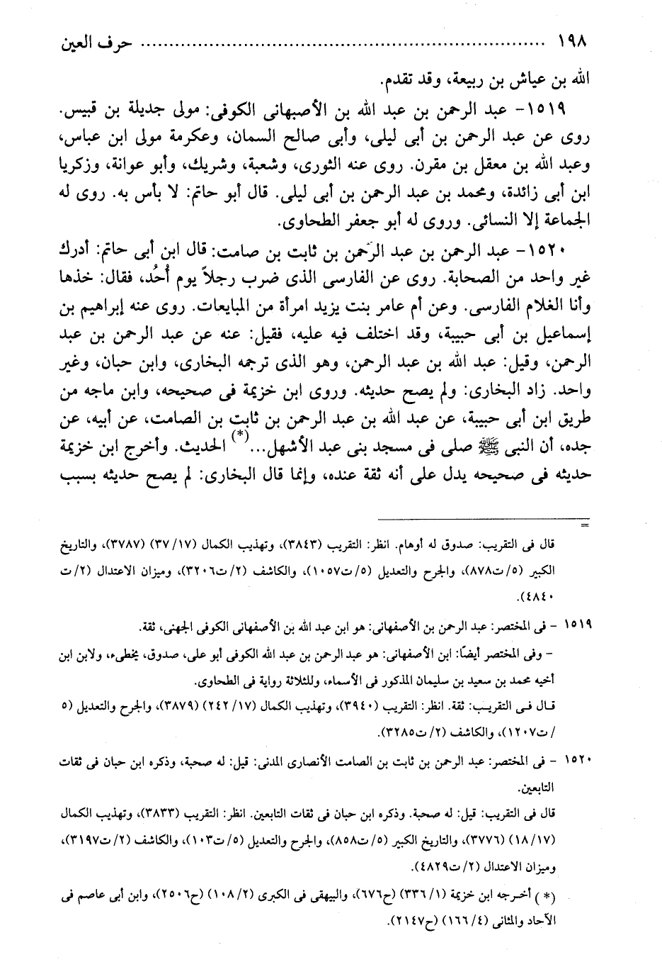 1520 - فى المختصر: عبد الرحمن بن ثابت بن الصامت الأنصارى المدنى: قيل: له صحبة، وذكره ابن حبان فى ثقات التابعين.