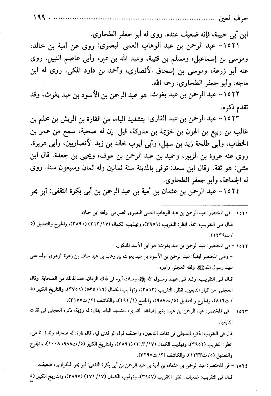1521 - عبد الرحمن بن عبد الوهاب العمى البصرى: روى عن أمية بن خالد، وموسى بن إسماعيل، ومسلم بن قتيبة، وعبد الله بن نمير، وأبى عاصم النبيل. روى عنه أبو زرعة، وموسى بن إسحاق الأنصارى، وأحمد بن داود المكى. روى له ابن ماجه، وأبو جعفر الطحاوى، رحمه الله.
