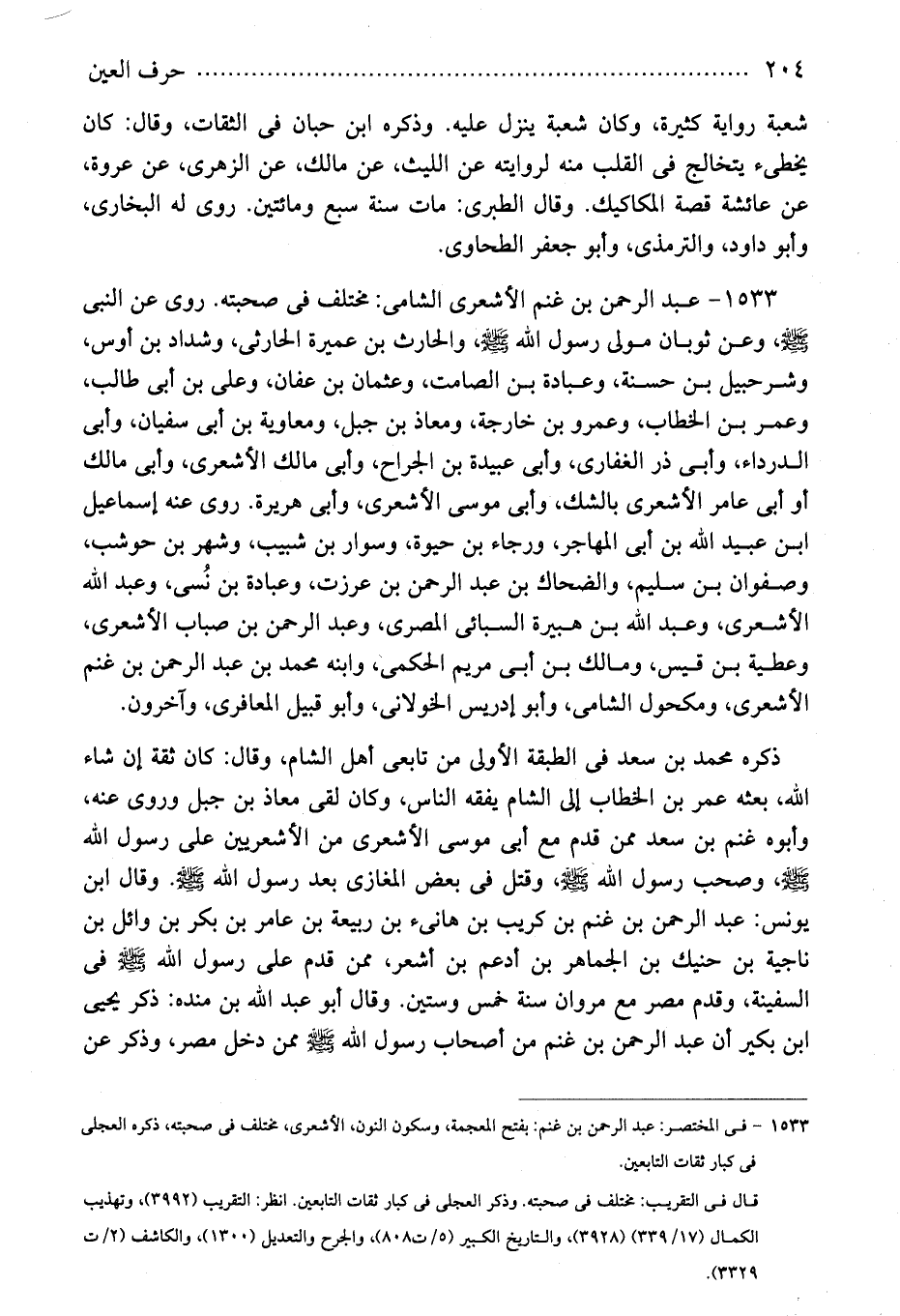 1533 - عبد الرحمن بن غنم الأشعرى الشامى: مختلف فى صحبته. روى عن النبى - صلى الله عليه وسلم -، وعن ثوبان مولى رسول الله - صلى الله عليه وسلم -، والحارث بن عميرة الحارثى، وشداد بن أوس، وشرحبيل بن حسنة، وعبادة بن الصامت، وعثمان بن عفان، وعلى بن أبى طالب، وعمر بن الخطاب، وعمرو بن خارجة، ومعاذ بن جبل، ومعاوية بن أبى سفيان، وأبى الدرداء، وأبى ذر الغفارى، وأبى عبيدة بن الجراح، وأبى مالك الأشعرى، وأبى مالك أو أبى عامر الأشعرى بالشك، وأبى موسى الأشعرى، وأبى هريرة. روى عنه إسماعيل ابن عبيد الله بن أبى المهاجر، ورجاء بن حيوة، وسوار بن شبيب، وشهر بن حوشب، وصفوان بن سليم، والضحاك بن عبد الرحمن بن عرزت، وعبادة بن نُسى، وعبد الله الأشعرى، وعبد الله بن هبيرة السبائى المصرى، وعبد الرحمن بن صباب الأشعرى، وعطية بن قيس، ومالك بن أبى مريم الحكمى، وابنه محمد بن عبد الرحمن بن غنم الأشعرى، ومكحول الشامى، وأبو إدريس الخولانى، وأبو قبيل المعافرى، وآخرون.