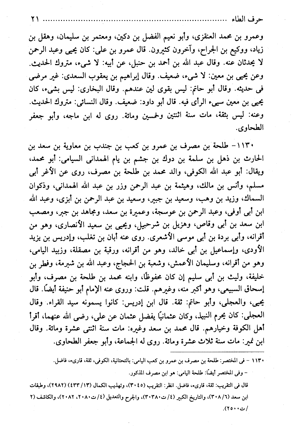 1130 - فى المختصر: طلحة بن مصرف بن عمرو بن كعب اليامى: بالتحتانية، الكوفى، ثقة، قارىء، فاضل.