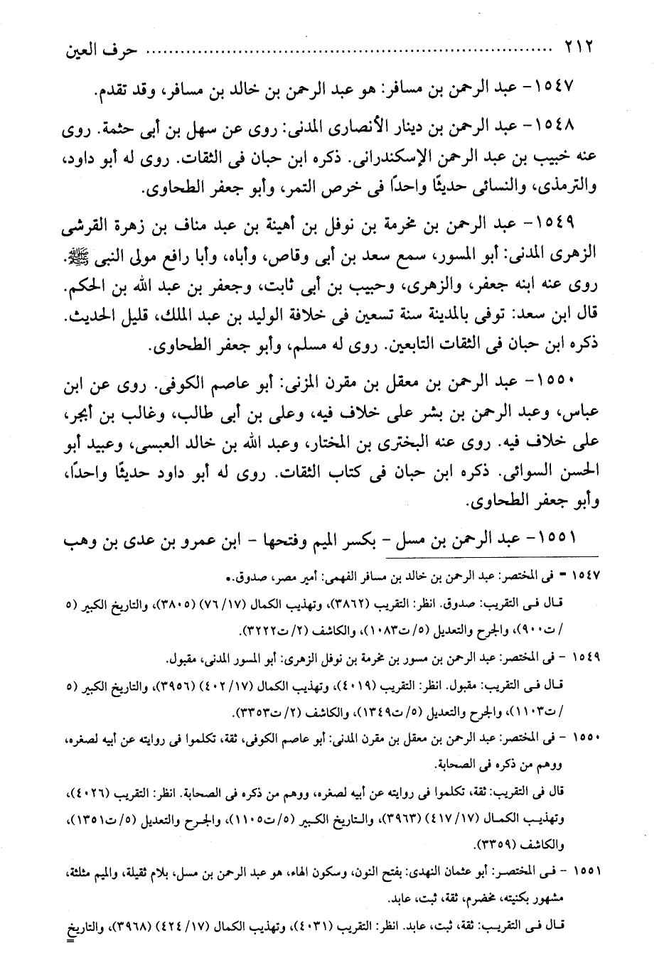 1550 - عبد الرحمن بن معقل بن مقرن المزنى: أبو عاصم الكوفى. روى عن ابن عباس، وعبد الرحمن بن بشر على خلاف فيه، وعلى بن أبى طالب، وغالب بن أبجر، على خلاف فيه. روى عنه البخترى بن المختار، وعبد الله بن خالد العبسى، وعبيد أبو الحسن السوائى. ذكره ابن حبان فى كتاب الثقات. روى له أبو داود حديثًا واحدًا، وأبو جعفر الطحاوى.