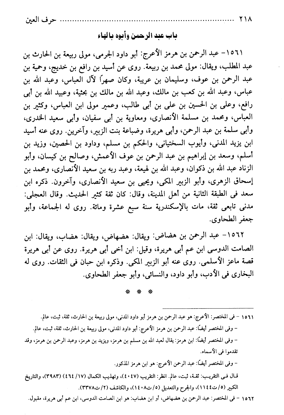 - وفى المختصر أيضًا: عبد الرحمن بن هرمز الأعرج: أبو داود المدنى، مولى ربيعة بن الحارث، ثقة، ثبت، عالم.