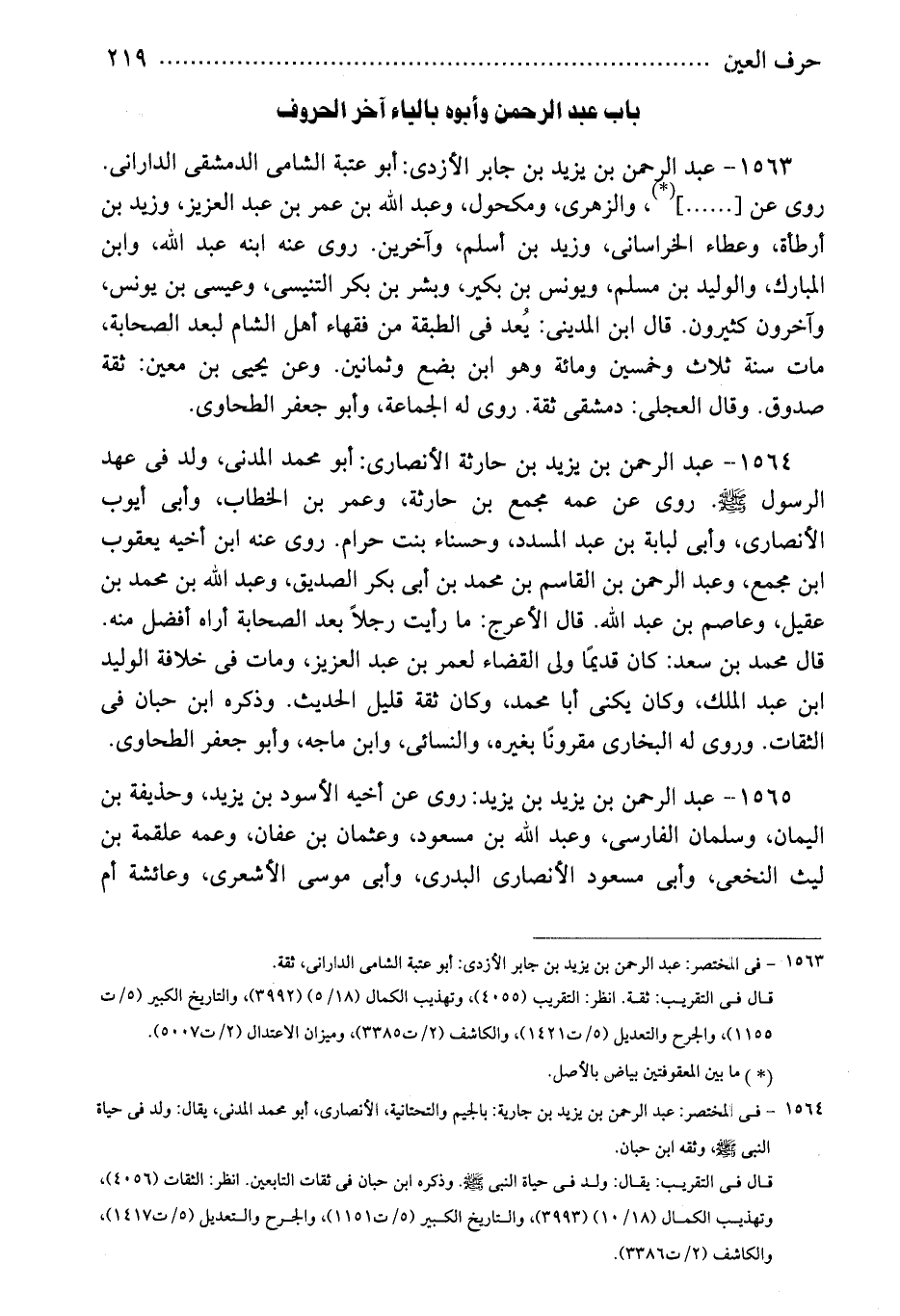 1565 - عبد الرحمن بن يزيد بن يزيد: روى عن أخيه الأسود بن يزيد، وحذيفة بن اليمان، وسلمان الفارسى، وعبد الله بن مسعود، وعثمان بن عفان، وعمه علقمة بن ليث النخعى، وأبى مسعود الأنصارى البدرى، وأبى موسى الأشعرى، وعائشة أم
