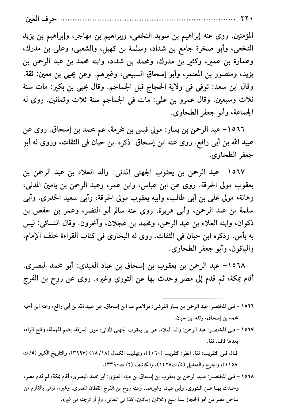 1567 - فى المختصر: عبد الرحمن: والد العلاء، هو ابن يعقوب الجهنى المدنى، مولى السرقة، بضم المهملة، وفتح الراء، بعدها قاف، ثقة.