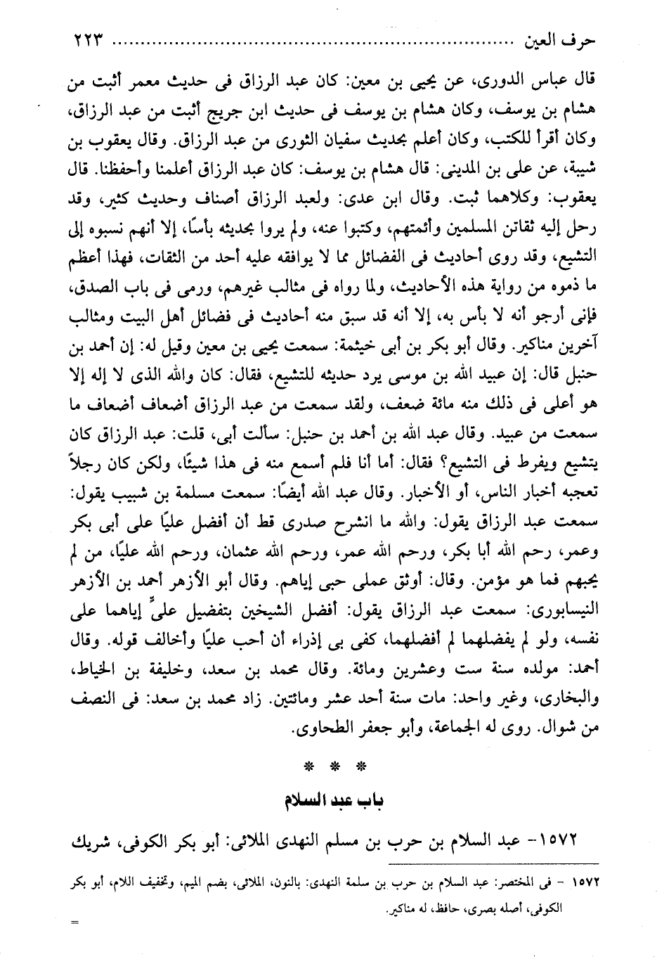 1572 - فى المختصر: عبد السلام بن حرب بن سلمة النهدى: بالنون، الملائى، بضم الميم، وتخفيف اللام، أبو بكر الكوفى، أصله بصرى، حافظ، له مناكير.