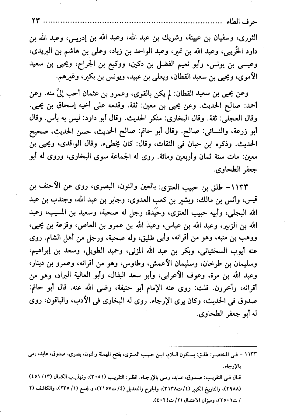 1133 - طلق بن حبيب العنزى: بالعين والنون، البصرى، روى عن الأحنف بن قيس، وأنس بن مالك، وبشير بن كعب العدوى، وجابر بن عبد الله، وجندب بن عبد الله البجلى، وأبيه حبيب العنزى، وحَيَدة، رجل له صحبة، وسعيد بن المسيب، وعبد الله بن الزبير، وعبد الله بن عباس، وعبد الله بن عمرو بن العاص، وقزعة بن يحيى، ووهب بن منبه، وهو من أقرانه، وأبى طليق، وله صحبة، ورجل من أهل الشام. روى عنه أيوب السختيانى، وبكر بن عبد الله المزنى، وحميد الطويل، وسعد بن إبراهيم، وسليمان بن طرخان، وسليمان الأعمش، وطاووس، وهو من أقرانه، وعمرو بن دينار، وعبد الله بن مرة، وعوف الأعرابى، وأبو سعد البقال، وأبو العالية البراد، وهو من أقرانه، وآخرون. قلت: روى عنه الإمام أبو حنيفة، رضى الله عنه. قال أبو حاتم: صدوق فى الحديث، وكان يرى الإرجاء. روى له البخارى فى الأدب، والباقون، روى له أبو جعفر الطحاوى.