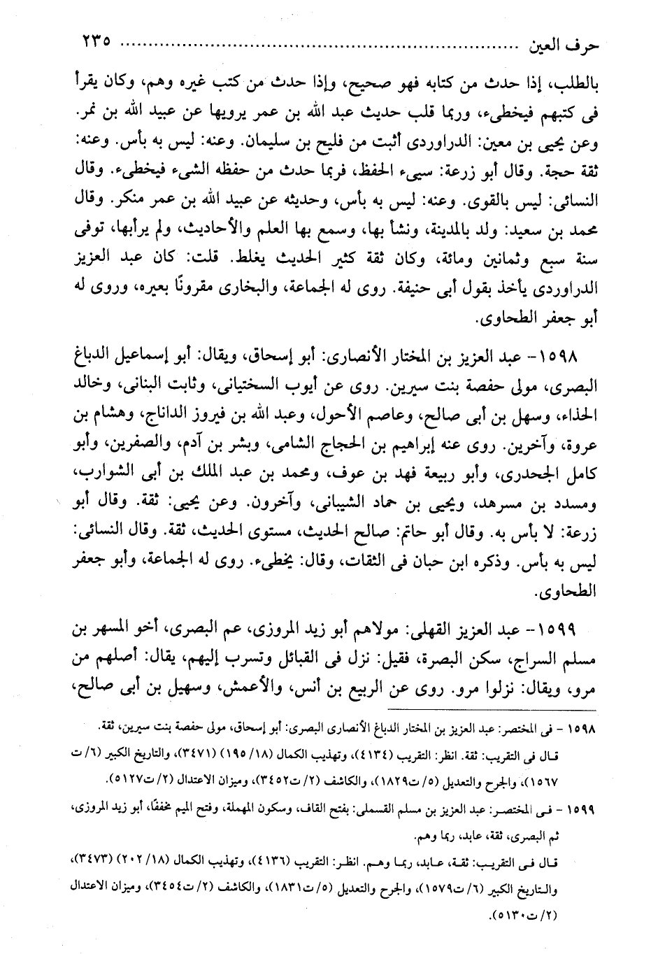 1598 - فى المختصر: عبد العزيز بن المختار الدباغ الأنصارى البصرى: أبو إسحاق، مولى حفصة بنت سيرين، ثقة.