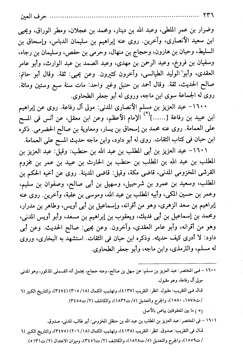 1600 - عبد العزيز بن مسلم الأنصارى المدنى: مولى آل رفاعة. روى عن إبراهيم ابن عبيد بن رفاعة [......] (*) الإمام الأعظم، وعن ابن معقل، عن أنس فى المسح على العمامة. روى عنه محمد بن إسحاق بن يسار، ومعاوية بن صالح الحضرمى. ذكره ابن حبان فى كتاب الثقات. روى له أبو داود، وابن ماجه حديث المسح على العمامة.