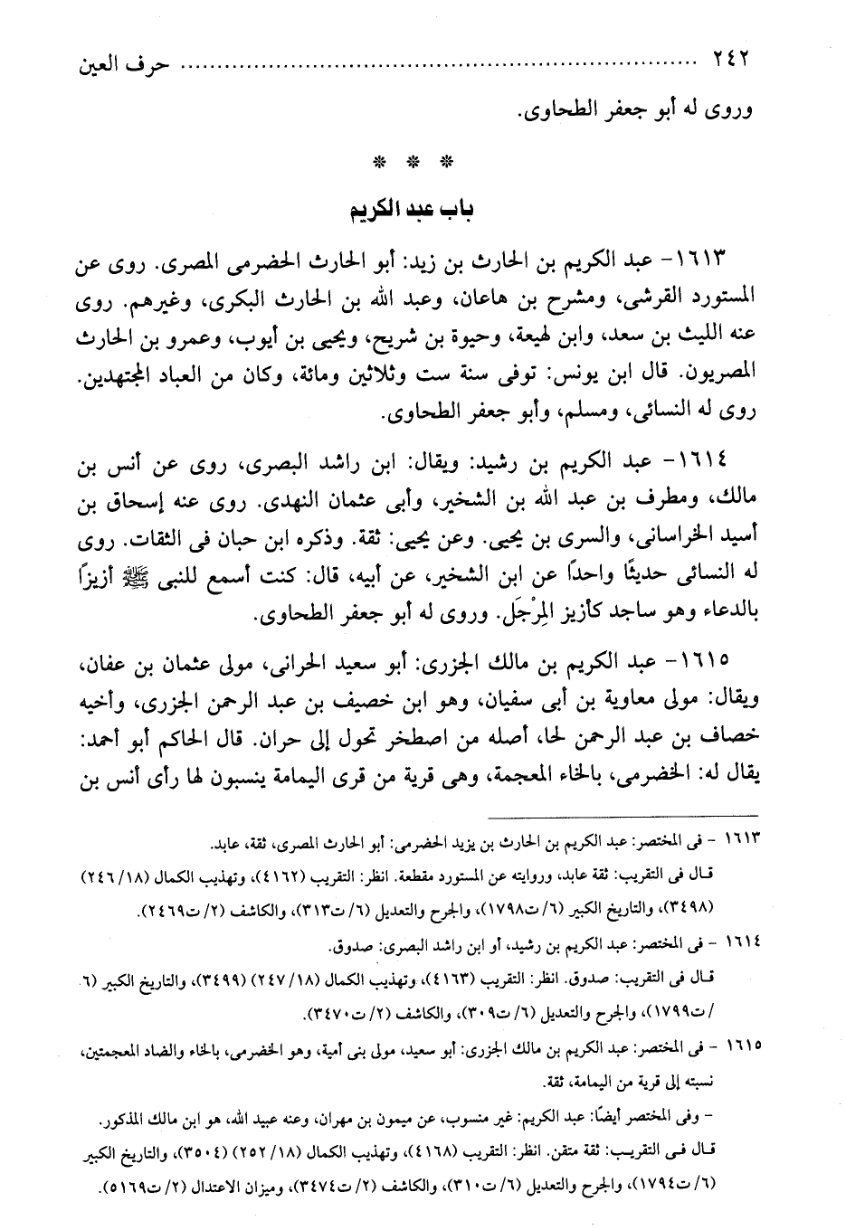 1615 - فى المختصر: عبد الكريم بن مالك الجزرى: أبو سعيد، مولى بنى أمية، وهو الخضرمى، بالخاء والضاد المعجمتين، نسبته إلى قرية من اليمامة، ثقة.