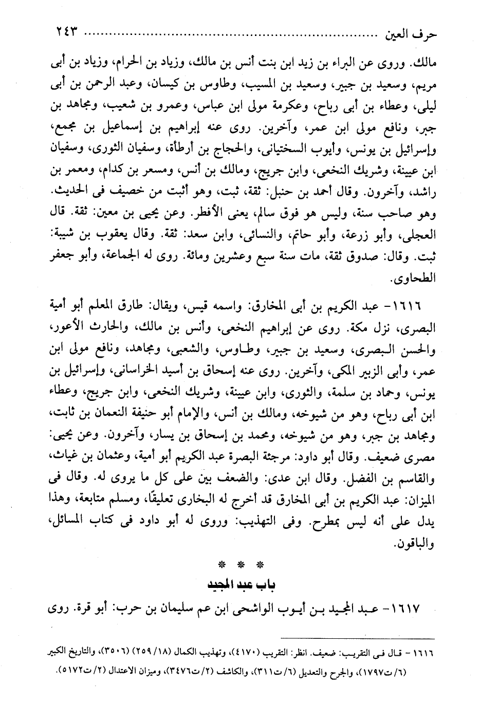 1616 - عبد الكريم بن أبى المخارق: واسمه قيس، ويقال: طارق المعلم أبو أمية البصرى، نزل مكة. روى عن إبراهيم النخعى، وأنس بن مالك، والحارث الأعور، والحسن البصرى، وسعيد بن جبير، وطاووس، والشعبى، ومجاهد، ونافع مولى ابن عمر، وأبى الزبير المكى، وآخرين. روى عنه إسحاق بن أسيد الخراسانى، وإسرائيل بن يونس، وحماد بن سلمة، والثورى، وابن عيينة، وشريك النخعى، وابن جريج، وعطاء ابن أبى رباح، وهو من شيوخه، ومالك بن أنس، والإمام أبو حنيفة النعمان بن ثابت، ومجاهد بن جبر، وهو من شيوخه، ومحمد بن إسحاق بن يسار، وآخرون. وعن يحيى: مصرى ضعيف. وقال أبو داود: مرجئة البصرة عبد الكريم أبو أمية، وعثمان بن غياث، والقاسم بن الفضل. وقال ابن عدى: والضعف بين على كل ما يروى له. وقال فى الميزان: عبد الكريم بن أبى المخارق قد أخرج له البخارى تعليقًا، ومسلم متابعة، وهذا يدل على أنه ليس بمطرح. وفى التهذيب: وروى له أبو داود فى كتاب المسائل، والباقون.